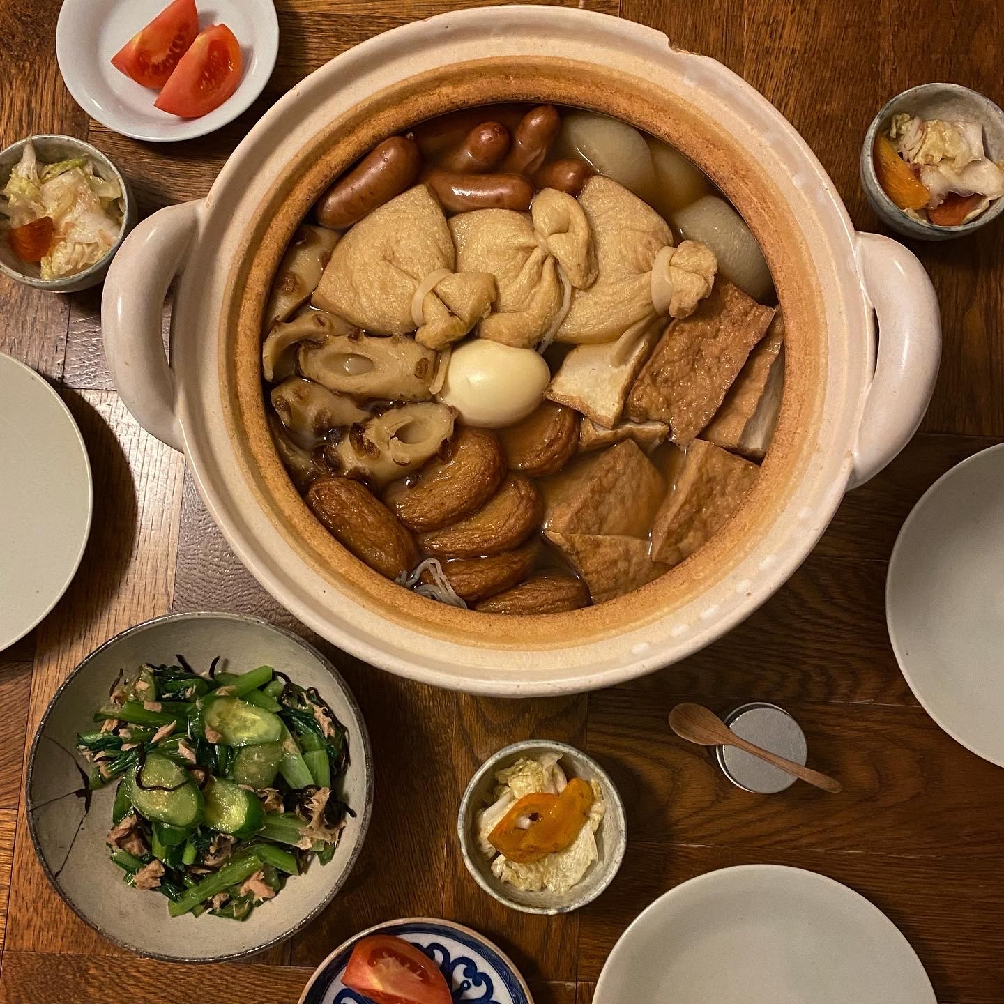 おでん、小松菜と胡瓜とツナの和え物、白菜と柿のサラダ、トマト、白ごはん