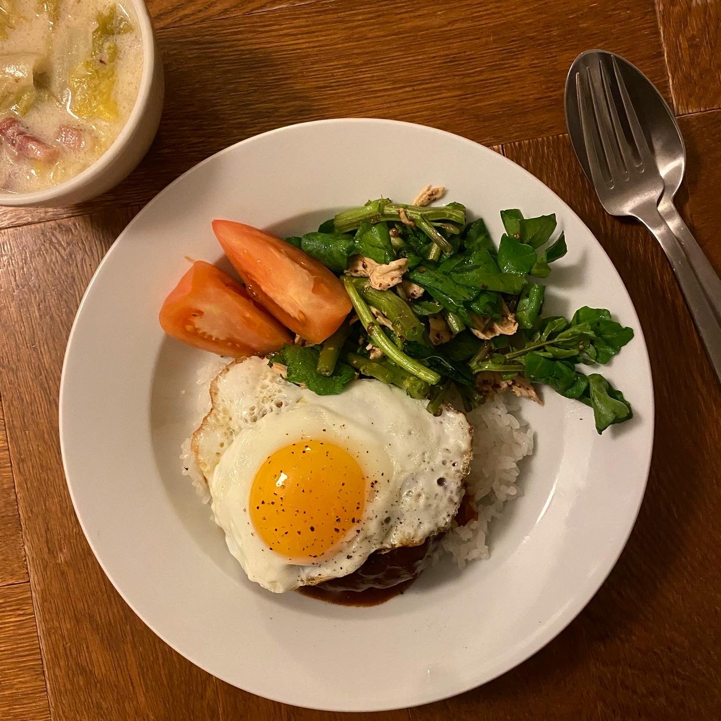 ロコモコ、ささみとクレソンのマスタード醤油和え、トマト、白菜とベーコンのミルクスープ(昨日の煮込みをアレンジ)