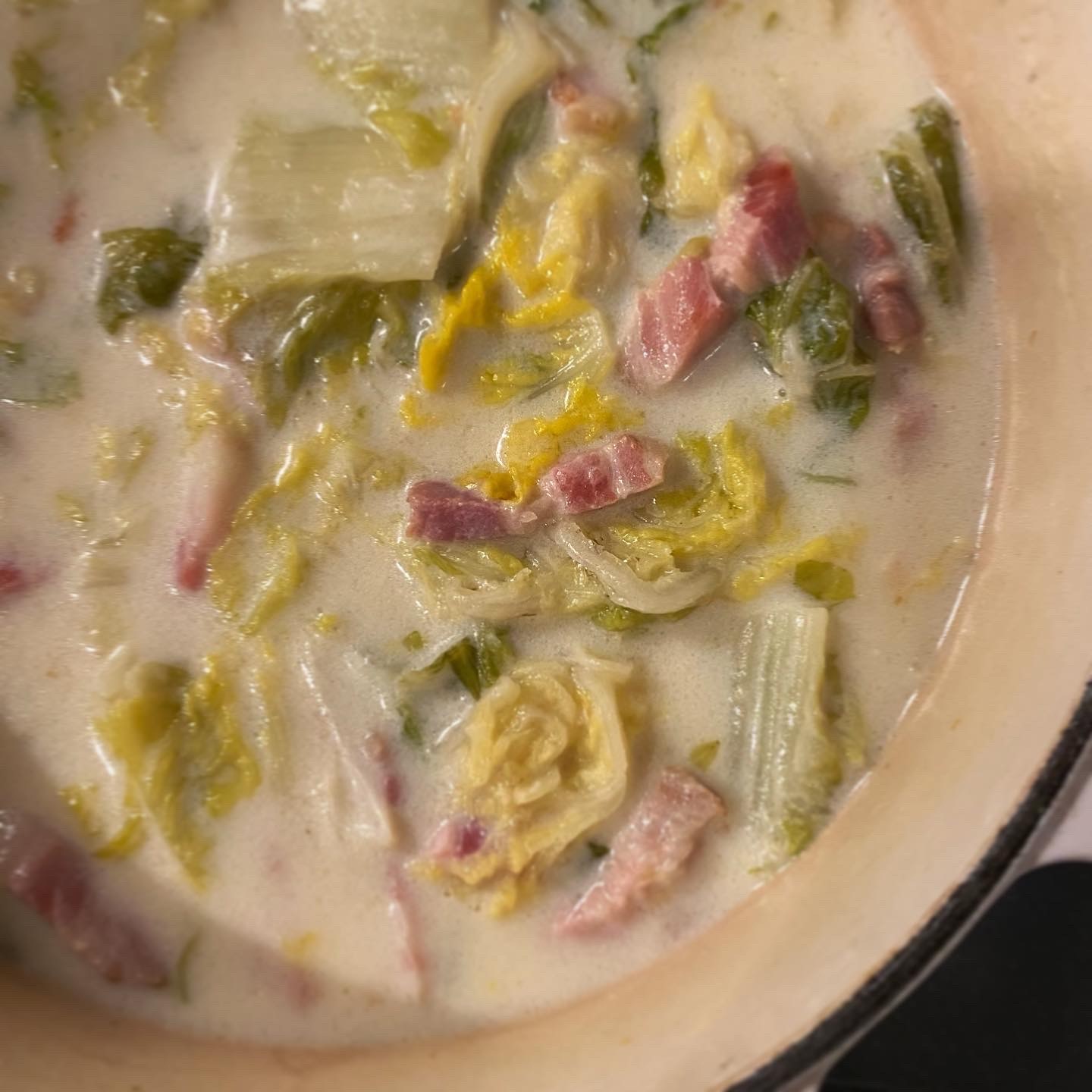 白菜とベーコンのミルク煮のっけごはん、ブロッコリーとトマトのサラダ