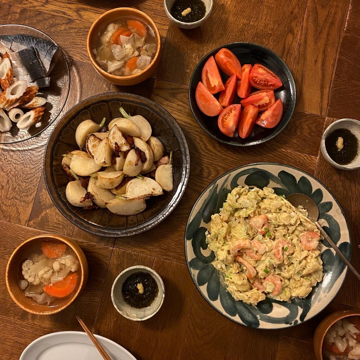 かぶとベーコンのソテー、海老と卵の炒め物、しめ鯖、鯛のちくわ、トマト、もずく酢、豚汁(昨日の)、白ごはん