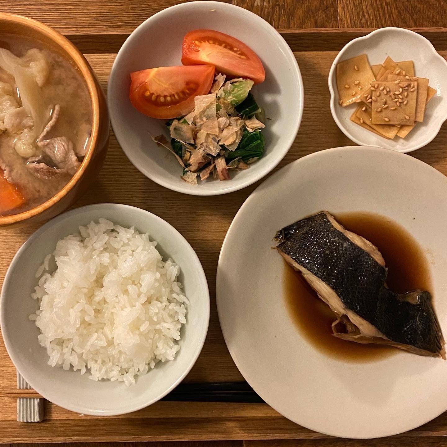 カレイの煮つけ、ほうれん草のお浸し、トマト、大根の皮のぽん酢漬け、人参とカリフラワーの豚汁、白ごはん