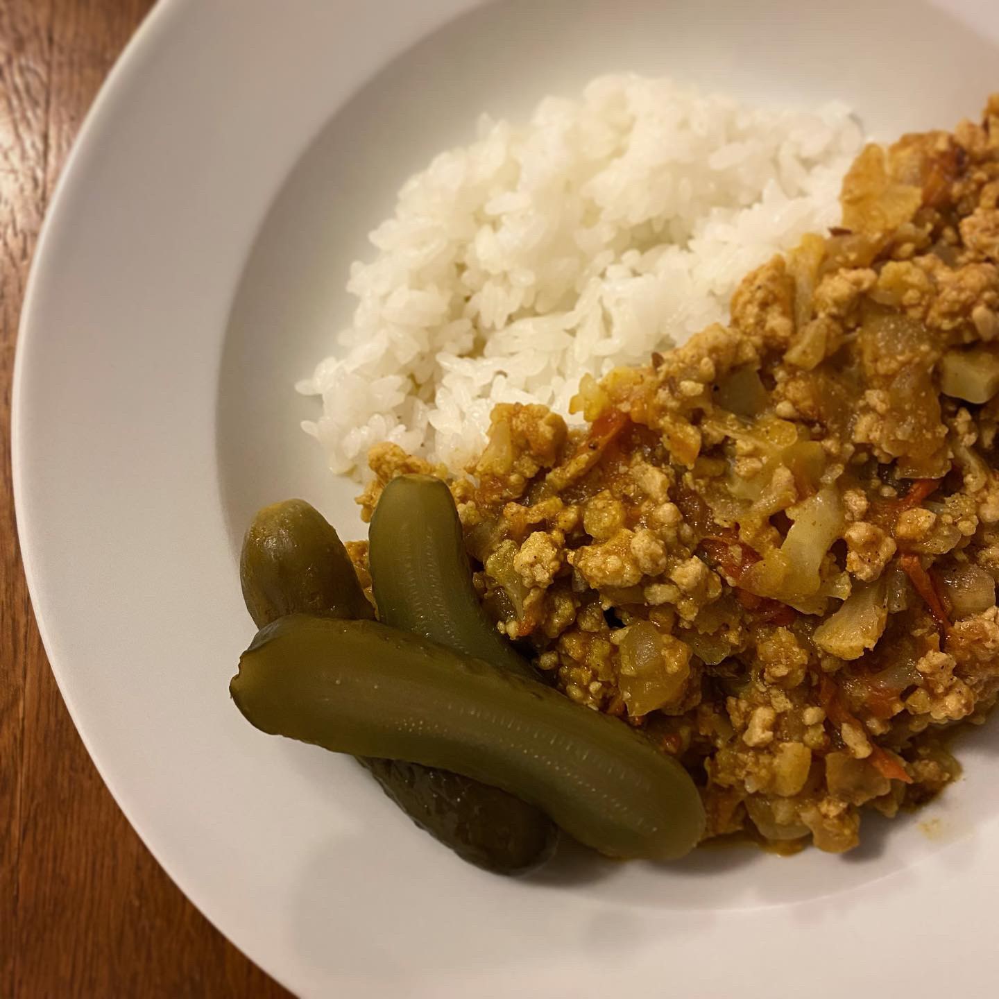 カリフラワーと鶏ひき肉のドライカレー、ピクルス、レタスとトマトのサラダ