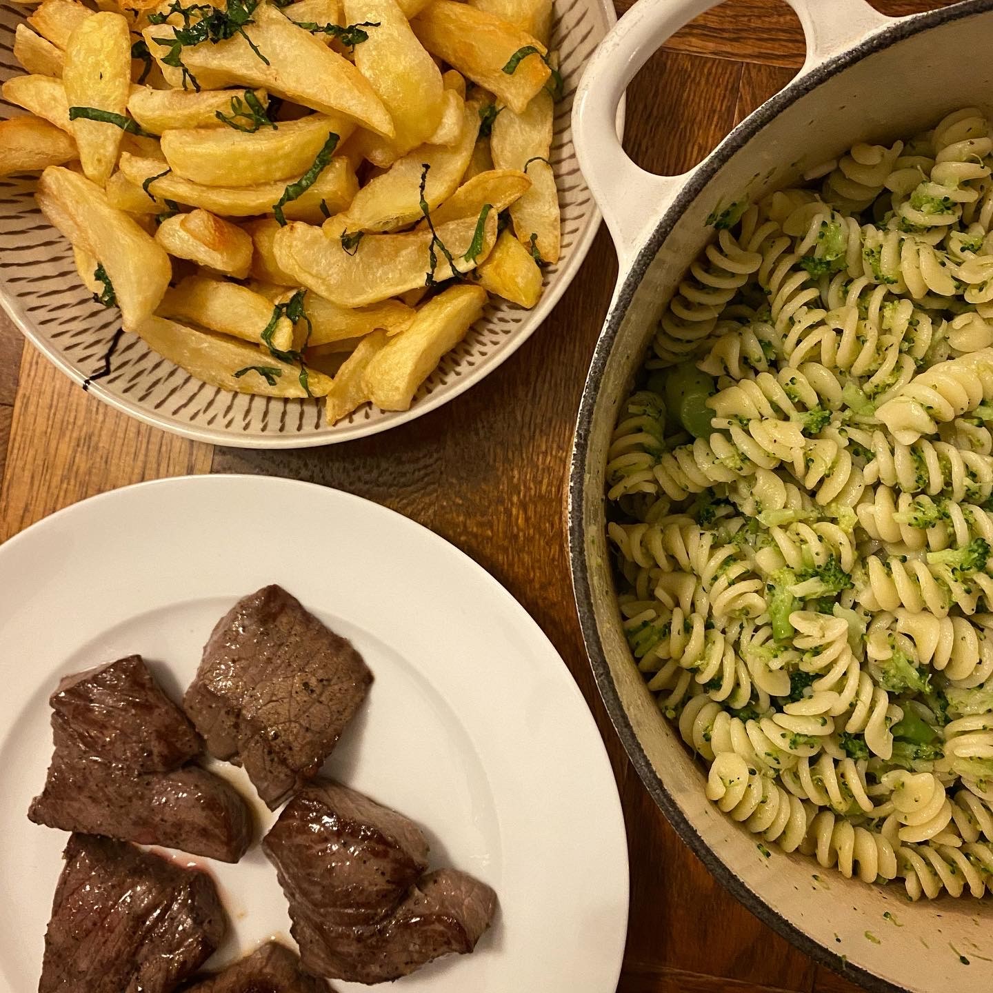 ブロッコリーのパスタ、ミニステーキ、しそじゃが、葉っぱのサラダ、トマト