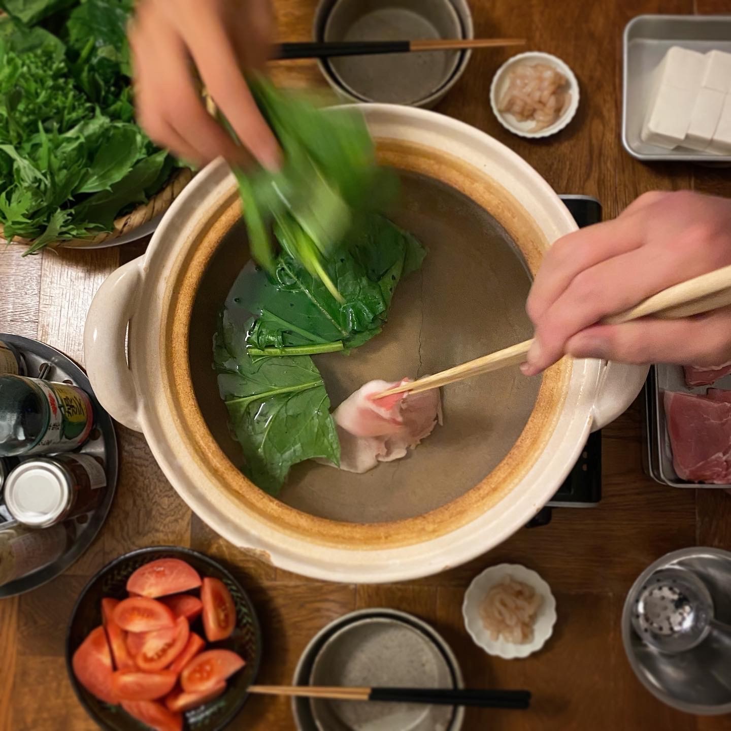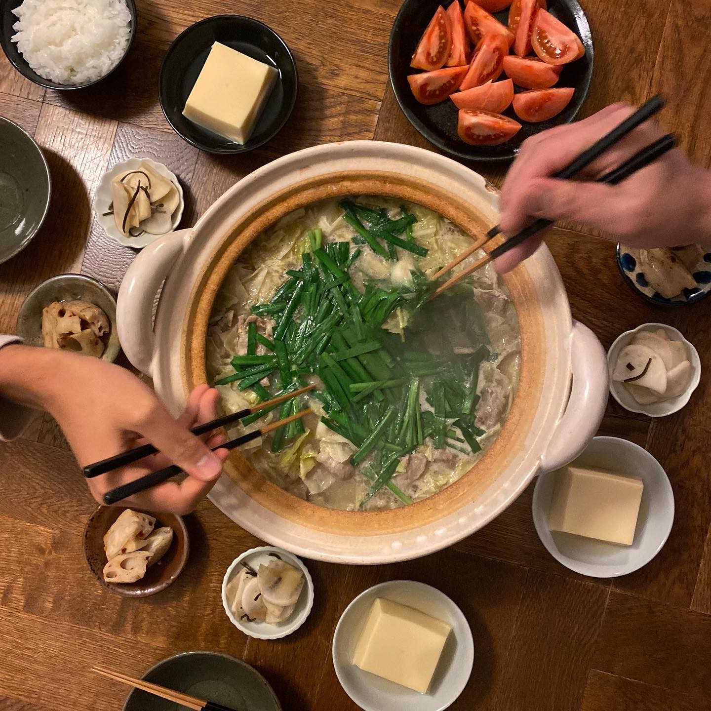 常夜鍋、いか明太、トマト、白ごはん