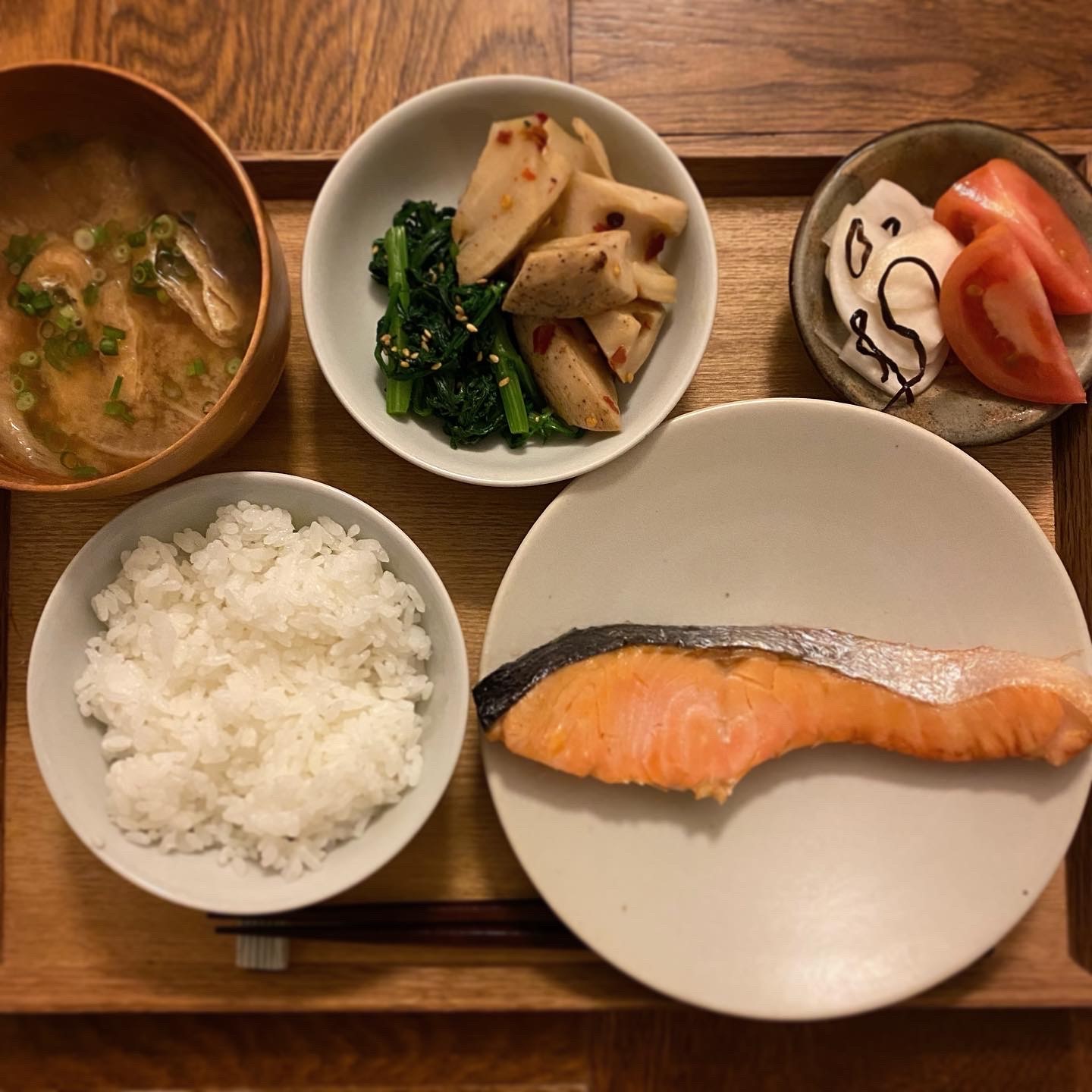 焼鮭、蓮根の唐辛子炒め、春菊の胡麻和え、かぶの塩昆布和え、トマト、味噌汁(油揚げ、大根、長ねぎ)、白ごはん