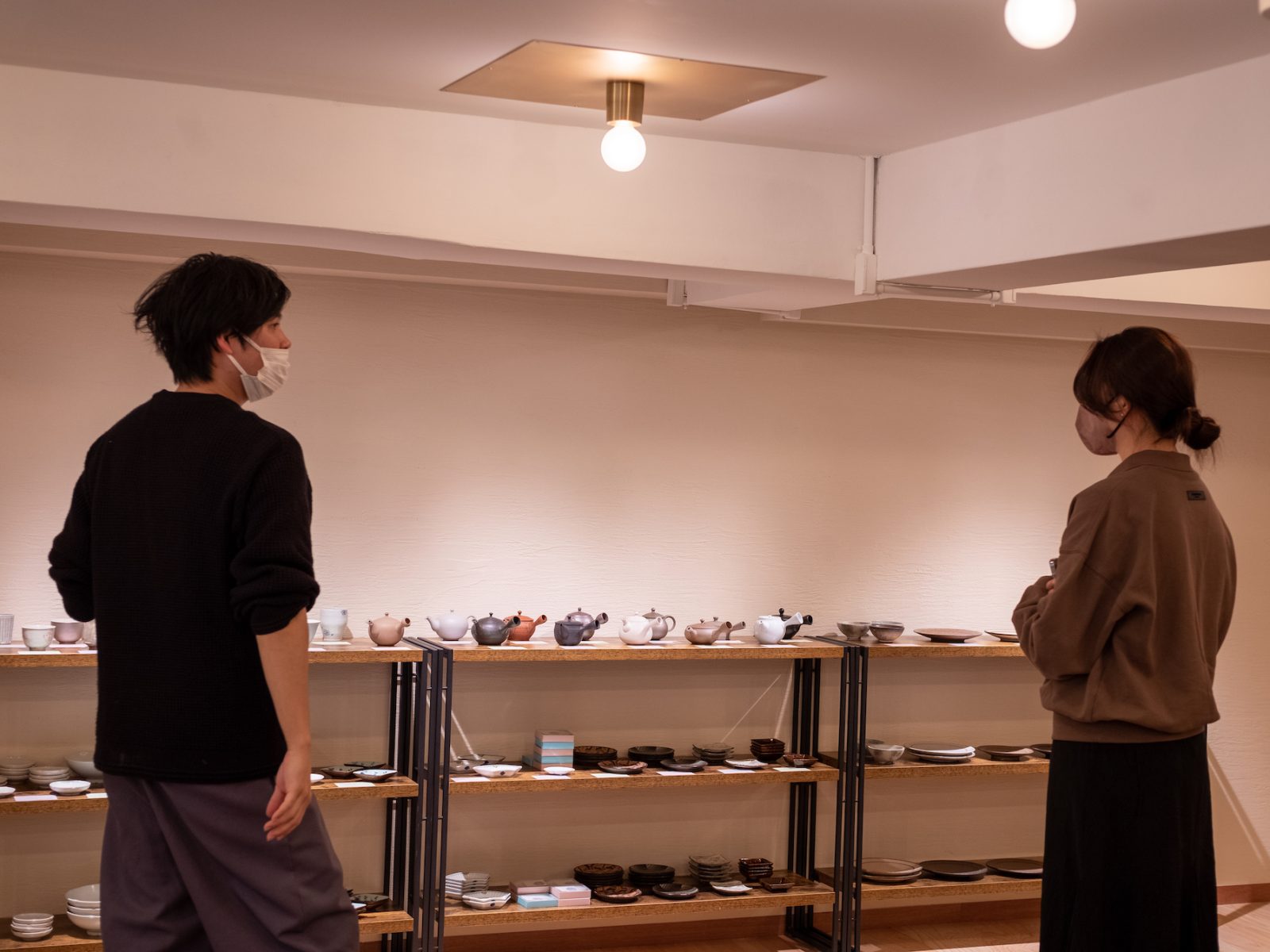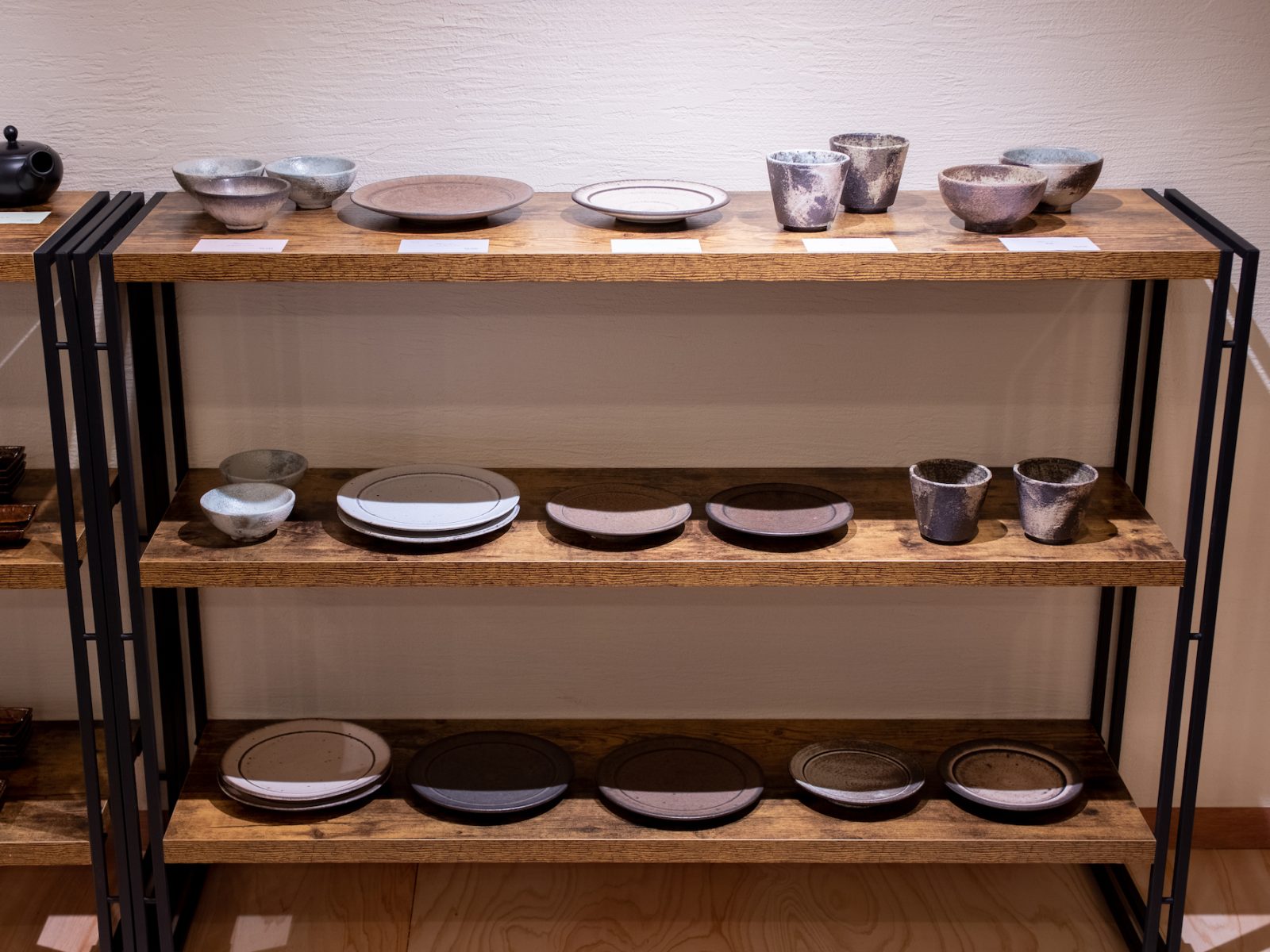 ご飯を食べて落ち着いた後。2階の陶器市の棚を見に行くと。ポスターや棚を準備してくれたバンブーカットのカットこと瑶太くんが、事務所から降りてきてくれました。ちなみにバンブーは順平さん。順平さんの苗字である竹内の「竹」と瑶太くんの苗字・切替の「切」でバンブーカット。梅と星、オーナーの二人。
