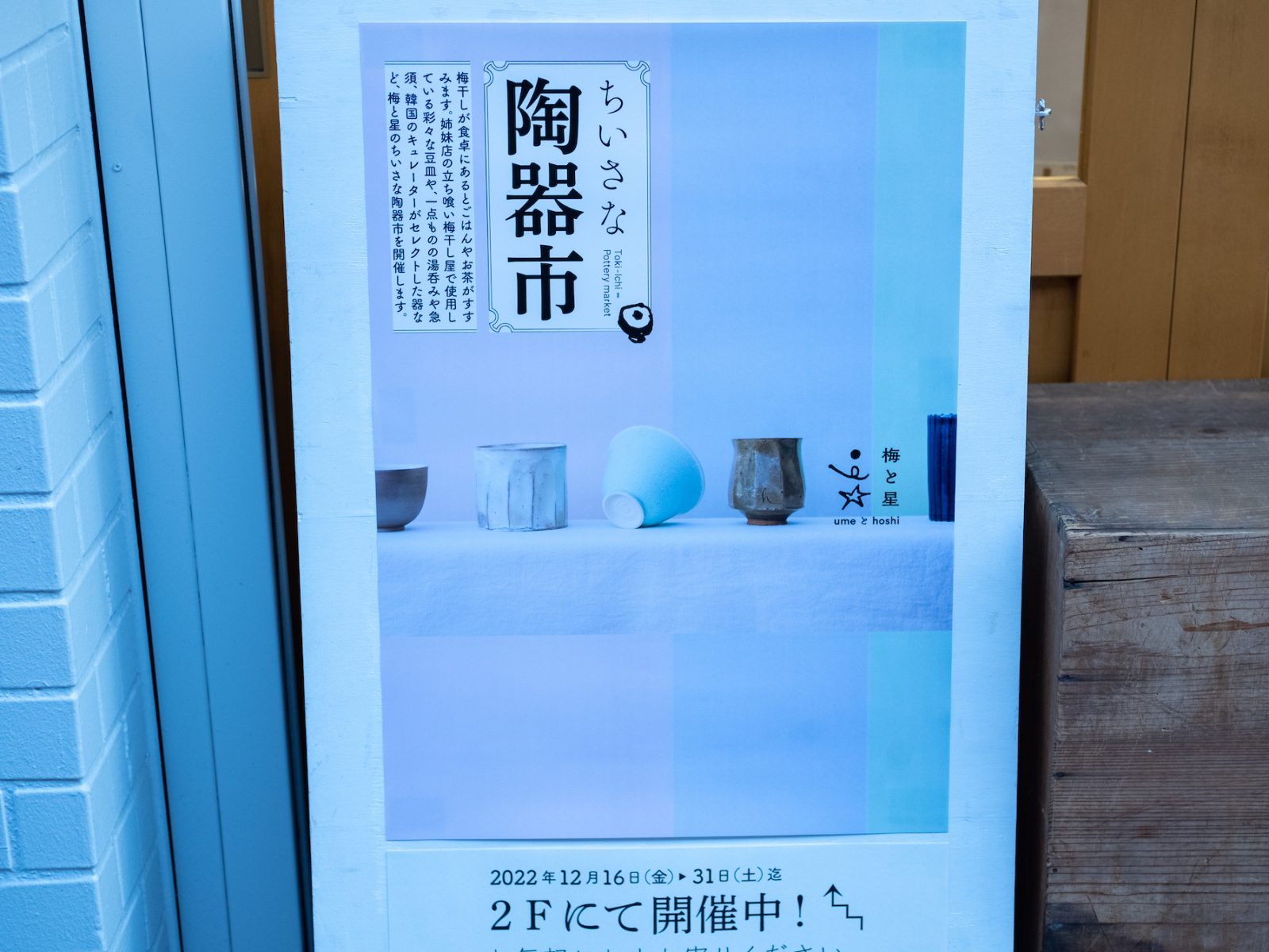 『韓国定食』は明日18日の日曜日まで、『ちいさな陶器市』は12月31日まで「梅と星」の2階のスペースで開催されています。ぜひ、お立ち寄りください。