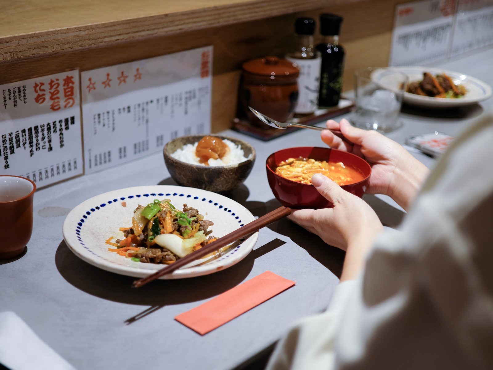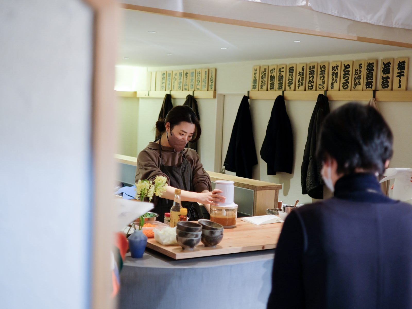 ナギョンちゃんセレクトによる韓国の陶磁器作家ユニット「陶藝堂」のお茶碗にごはんとキムチ梅。お客様の前にならぶぽてっと温かみのあるまぁるいお茶碗の中身は、みるみる空っぽになっていく。