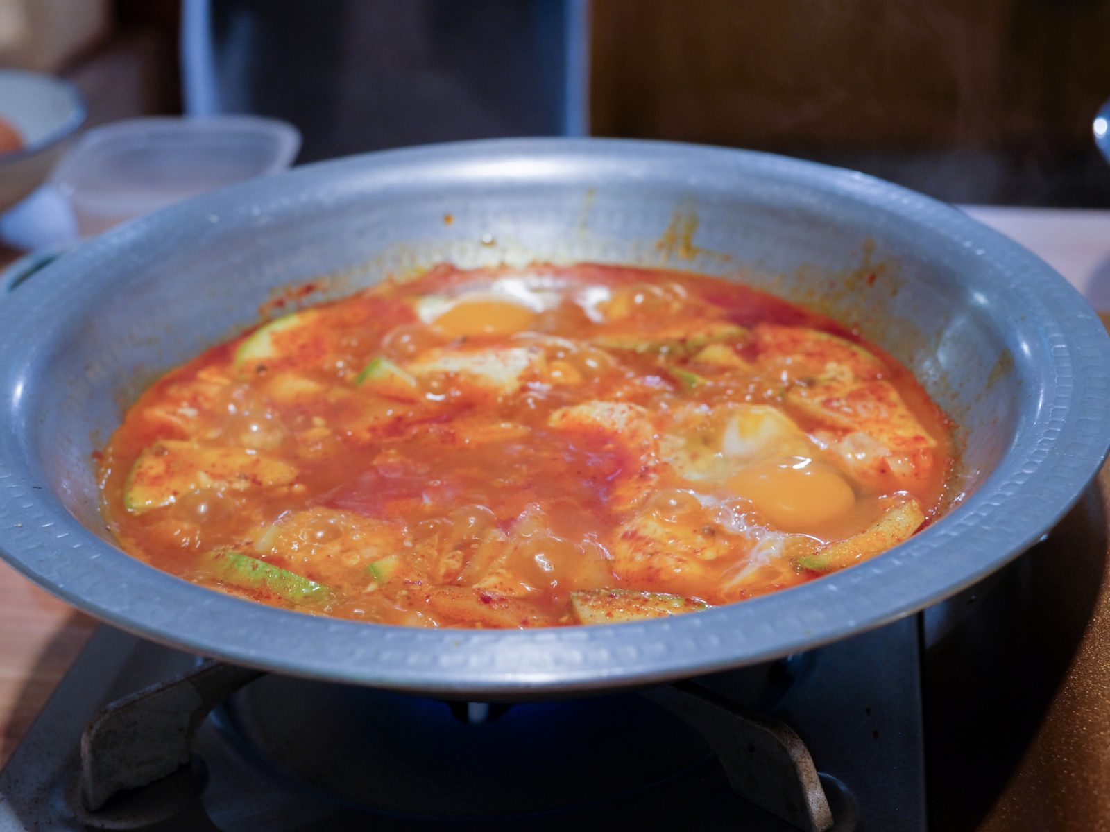 ラー油、韓国産の唐辛子、牛のひき肉、塩、ネギで作るスンドゥブの素。味噌の発酵臭ような香りのする旨味たっぷりの素。「コチュジャンを入れると、全然別の味になってしまうんです」合わせだしの中でおぼろ豆腐を静かにくずして、玉ねぎとズッキーニをいれて、先に作ったスンドゥブの素を溶かしていく。辛さはお好みで調整できる。野菜からも甘いだしが出る。最後にエノキと玉子を割り入れて、玉子の白身の部分が固まったら出来上がり。スンドゥブの素を多めに作っておけば、食べたい時にいつでもさっと食べられる。半熟の黄身をくずしてながら食べる。