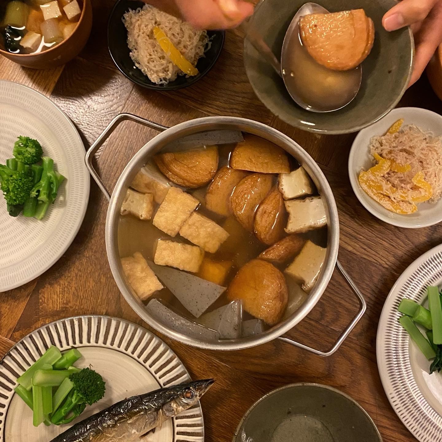 秋刀魚の塩焼き、おでん風煮物、しらたきのたらこ和え、ブロッコリーのお浸し、味噌汁(豆腐、長葱、わかめ)、白ごはん