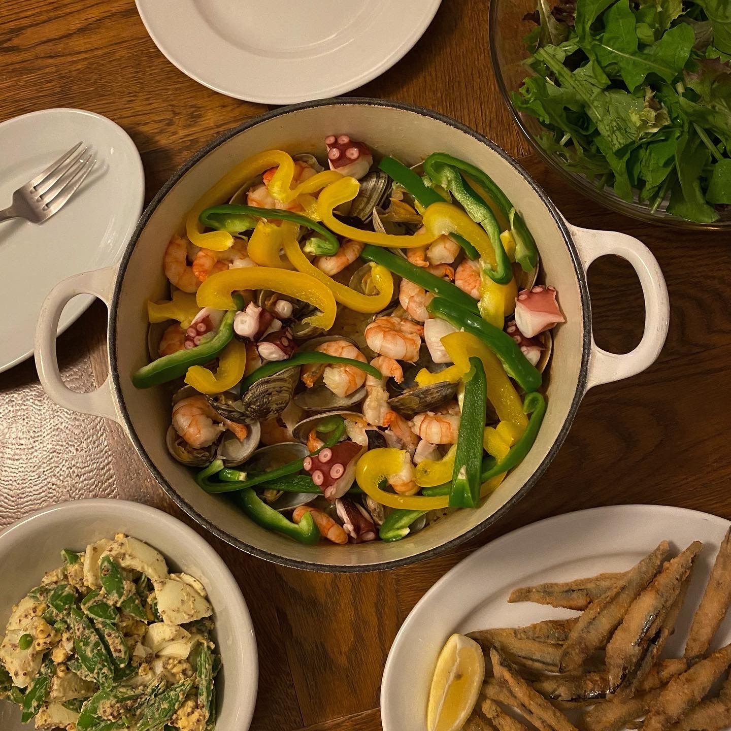 海鮮パエリア、きびなごフライ、ゆで卵とスナップえんどうのサラダ、葉っぱのサラダ