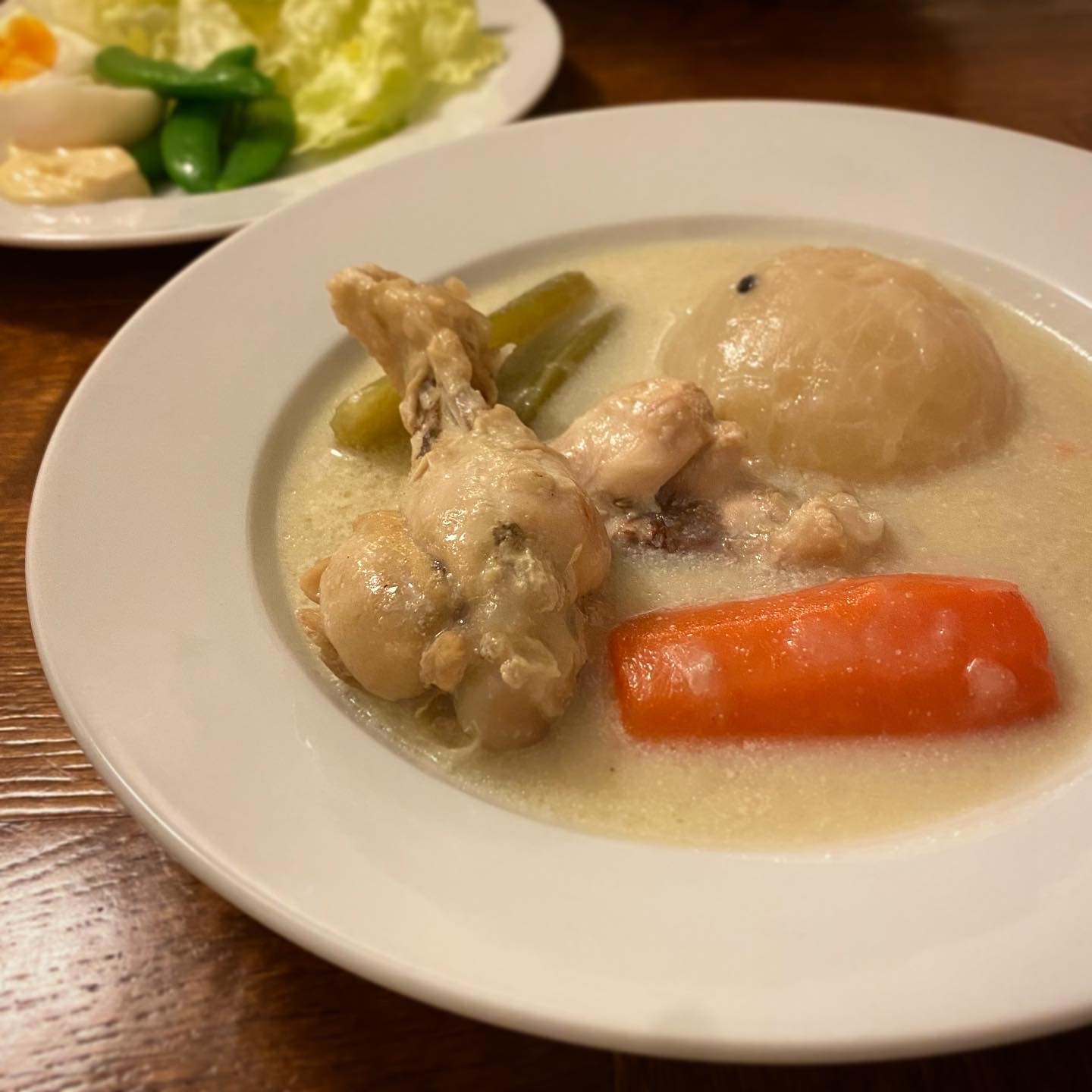 一昨日のポトフののこり、カレーにしようかホワイトシチューにしようか悩んで息子のリクエストでシチューに。