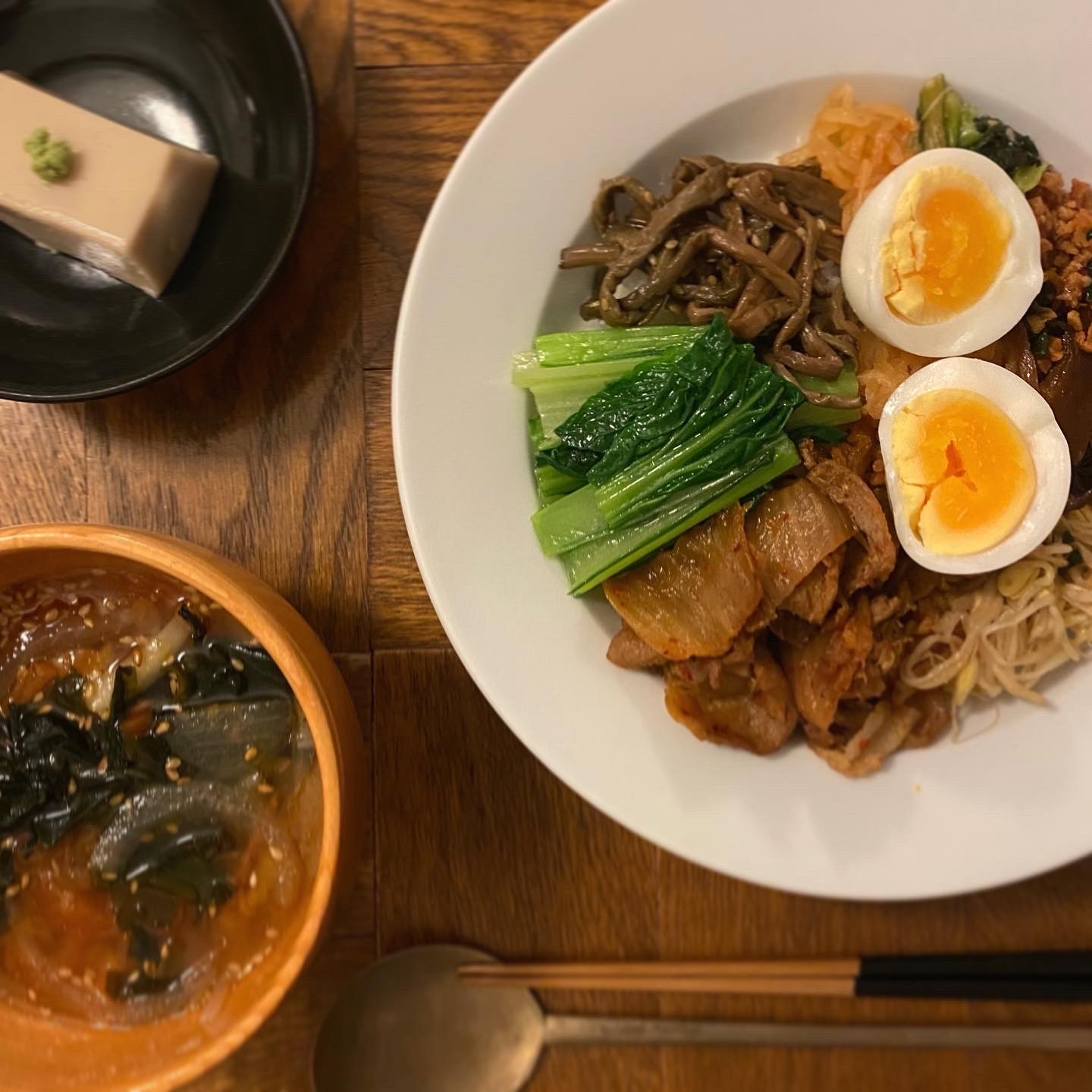 ビビンバ丼(豚キムチ、ゆで卵、ナムルいろいろ)、トマトとワカメと玉葱のスープ、胡麻豆腐