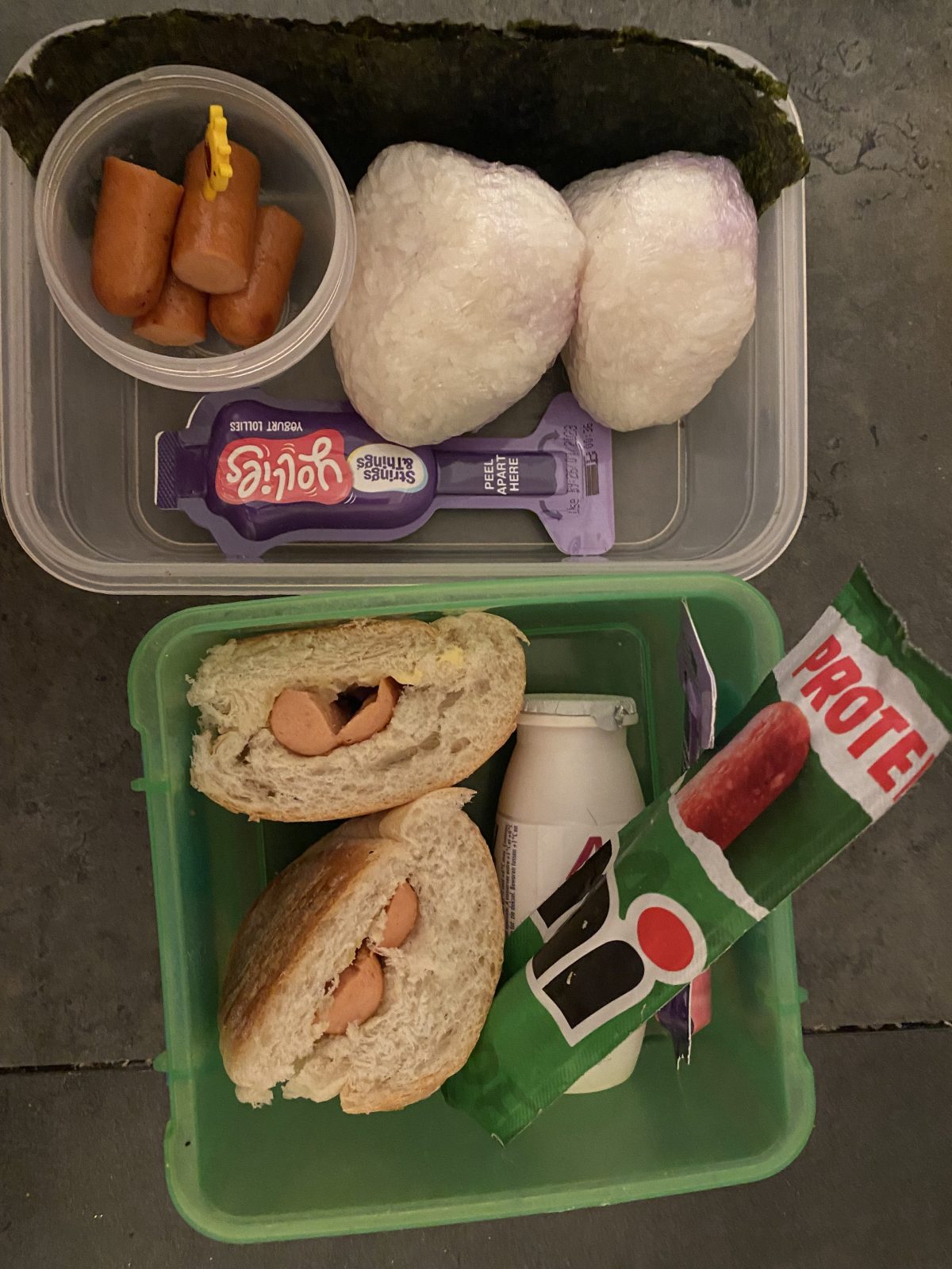 「スクールランチ、凄いんだよ!毎日パンかご飯、肉か魚、野菜のおかず、フルーツがでるの。4コースミールだよ!豪華でしょ!毎日違うご飯でおいしいし温かいんだ!日本の学校最高だよ」