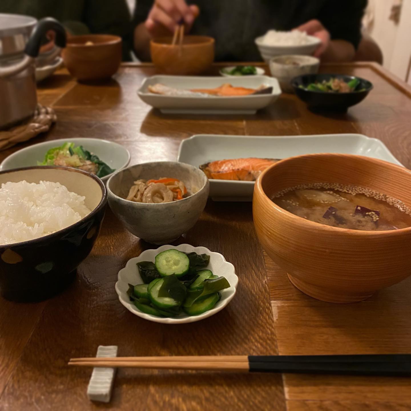 焼鮭、切り干し大根煮、小松菜お浸し、わかめと胡瓜の酢の物、味噌汁(さつま芋、長葱、胡麻)、白ごはん