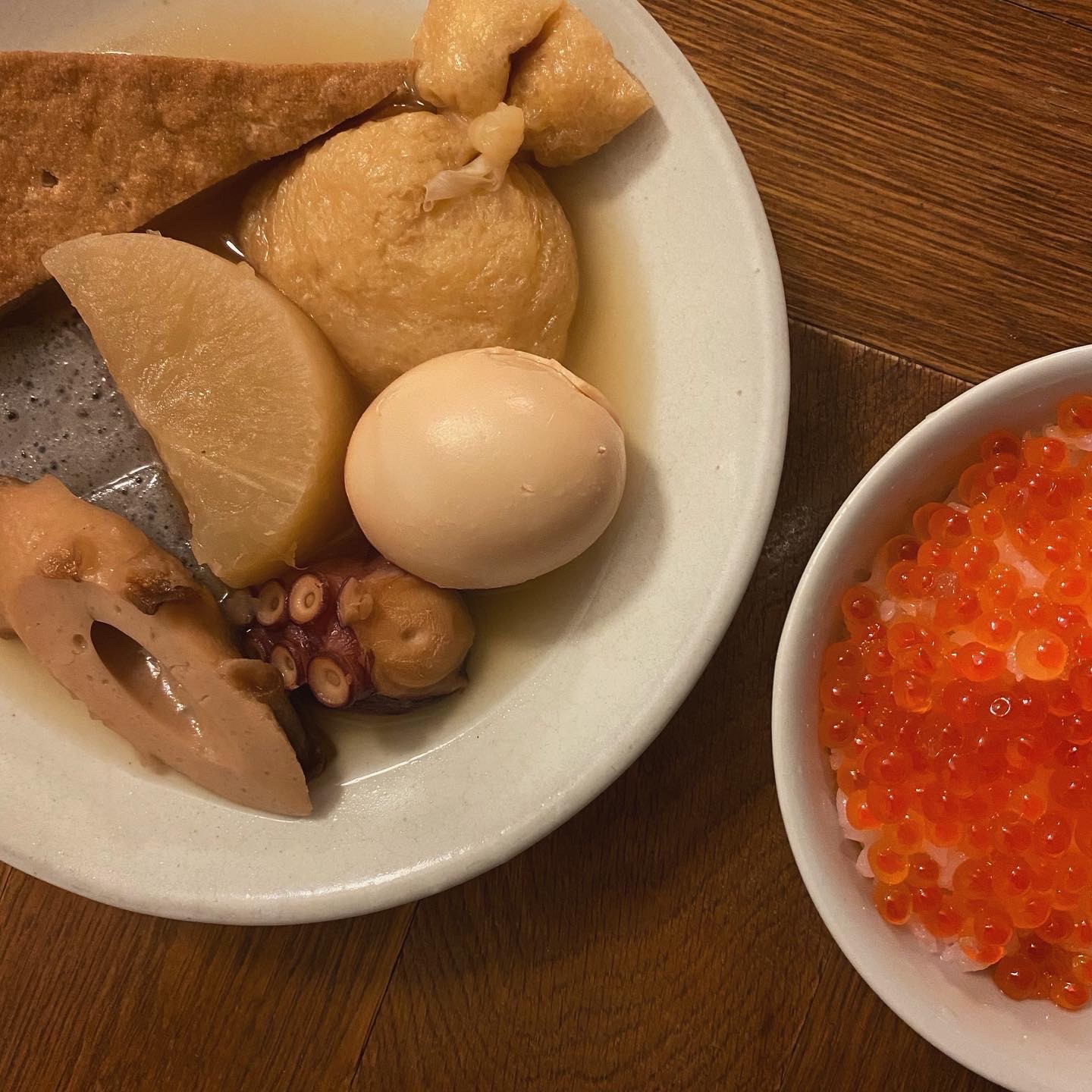 いくらごはん、おでん(day2)、胡瓜とかぶの塩昆布和え