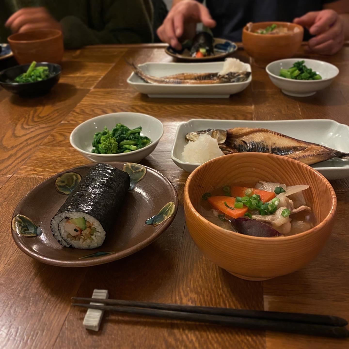 恵方巻、鰯の干物(大根おろし)、菜の花のお浸し、豚汁、おでん(day3)