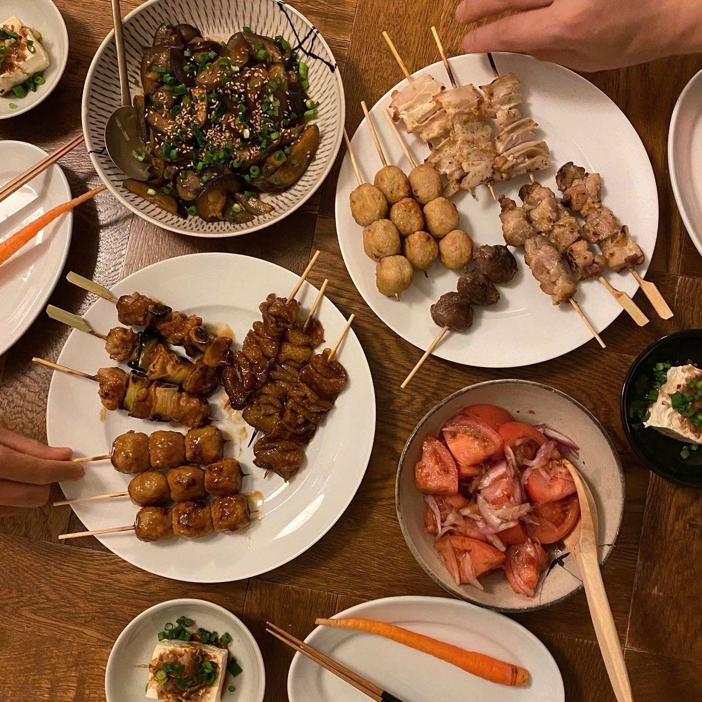 焼き鳥、茄子の炒め物、トマトと赤玉葱の甘酢漬け、冷奴、人参スティック、白ごはん
