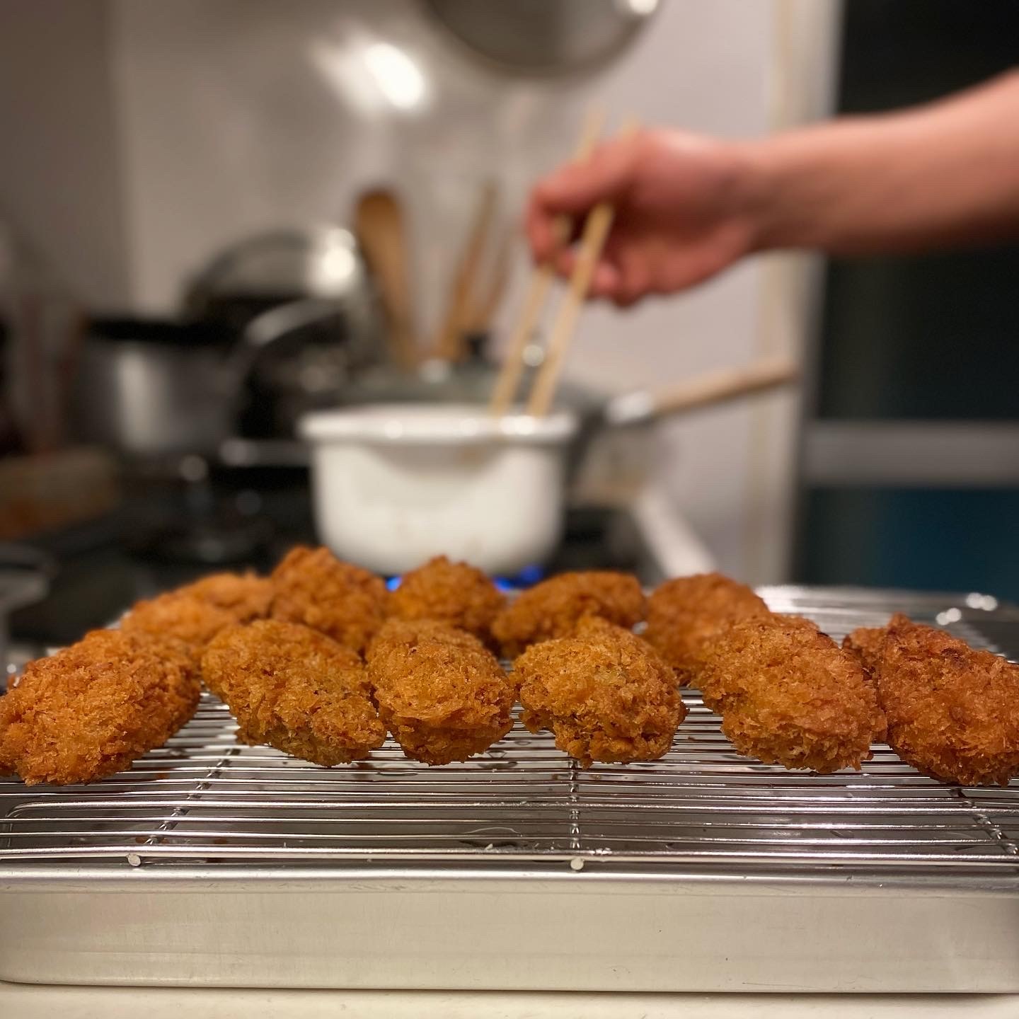 カキフライ(千切りキャベツ、トマト、タルタルソース)、こんにゃくの煮物、いぶりがっこ、味噌汁(豆腐、ワカメ、葱)、白ごはん