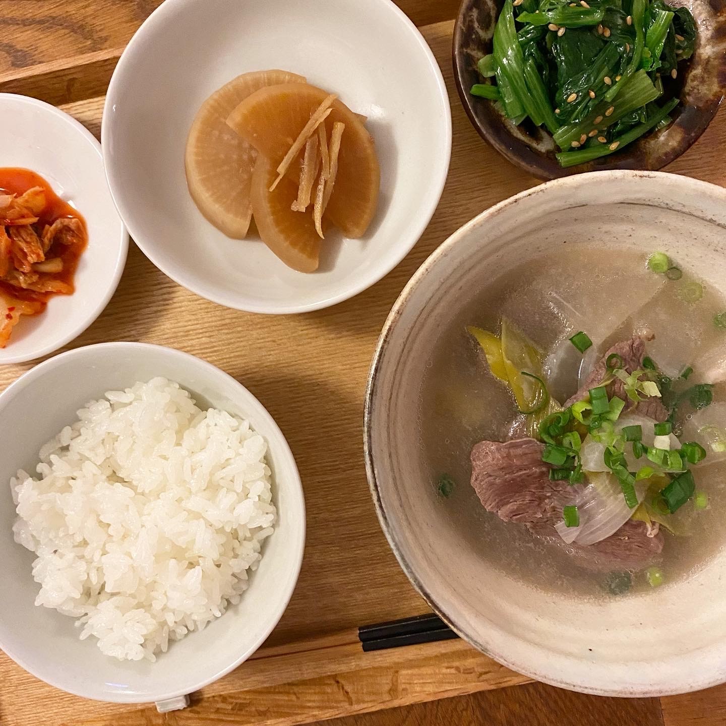 コムタンスープ、小松菜ナムル、大根の煮物(昨日ののこり)、キムチ、白ごはん