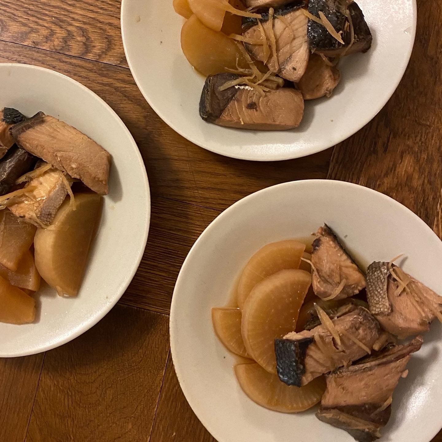 ぶり大根、ブロッコリーお浸し(粒マスタード)、厚揚げ網焼き(赤玉ねぎ、おかか醤油)、味噌汁(トマト、しめじ、葱)、白ごはん