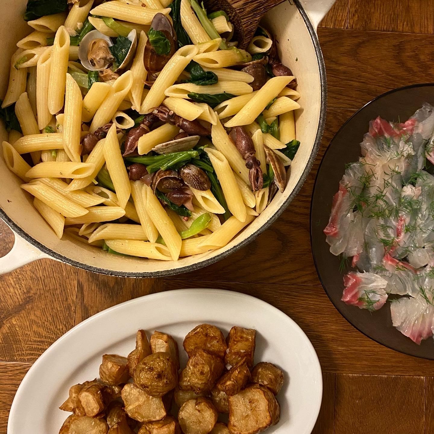 ほたるいかとあさりと茎立菜のペンネ、鯛のカルパッチョ、菊芋の素揚げ、葉っぱサラダ、トマト