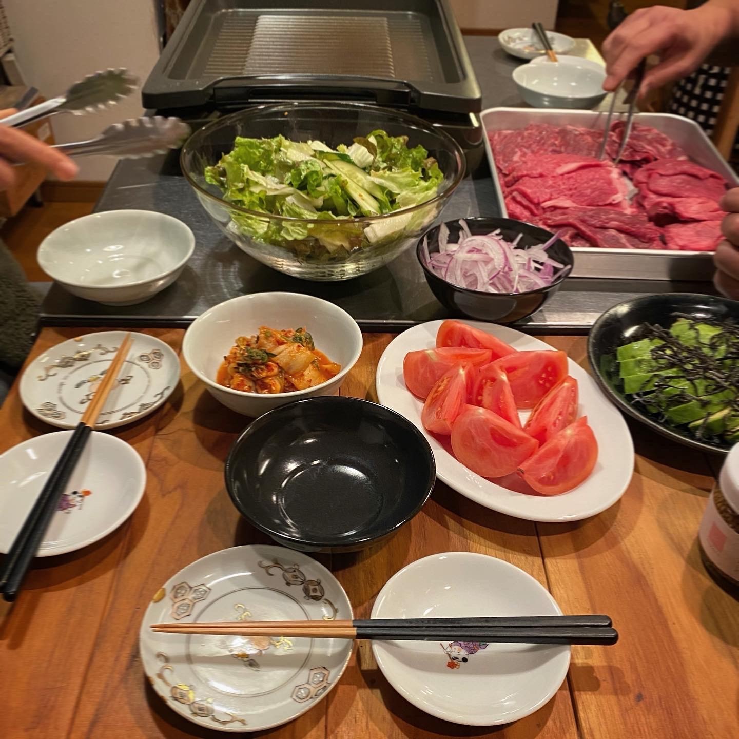 焼肉、チョレギサラダ、アボカド塩昆布、トマト、キムチ、白ごはん