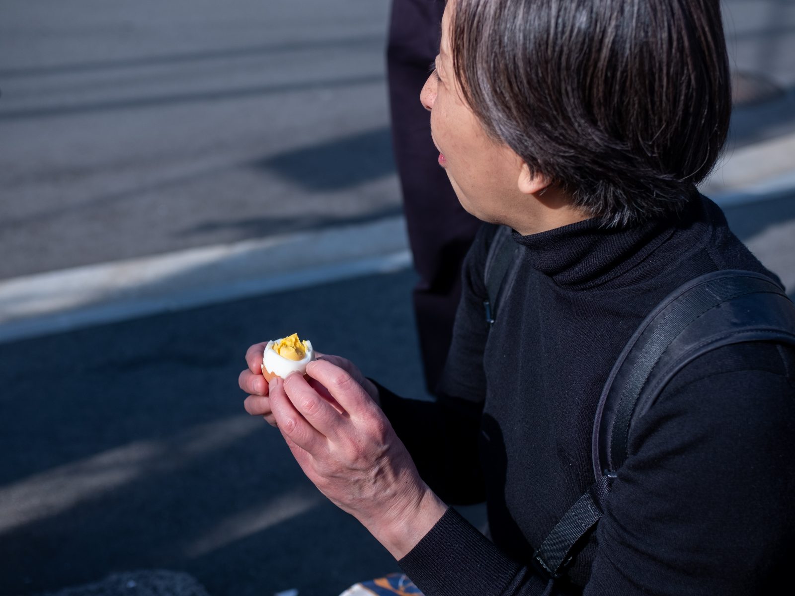 確かにそれはあるかも。「うんまいねぇ」和枝さんは正座の状態で卵をほおばっています。それぞれのスタイルで熱海ウェルカム蒸し卵を食べる。