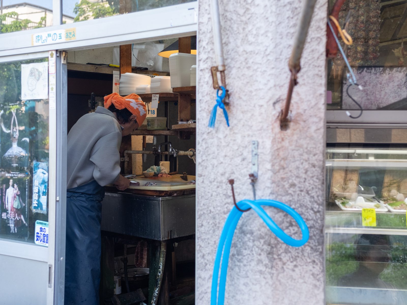 魚の頭を店主の方がぽんと投げると長いクチバシでナイスキャッチ。