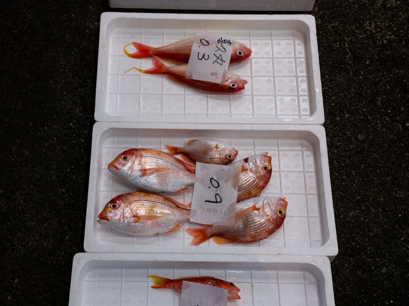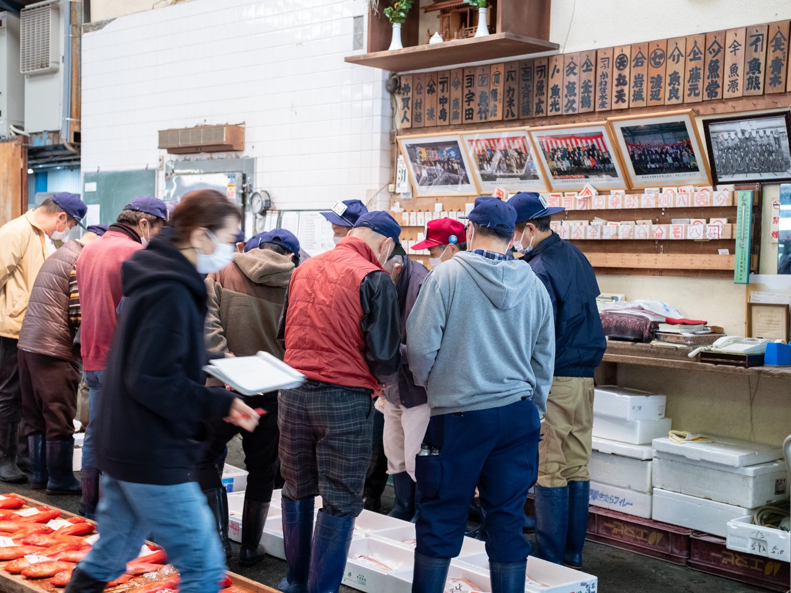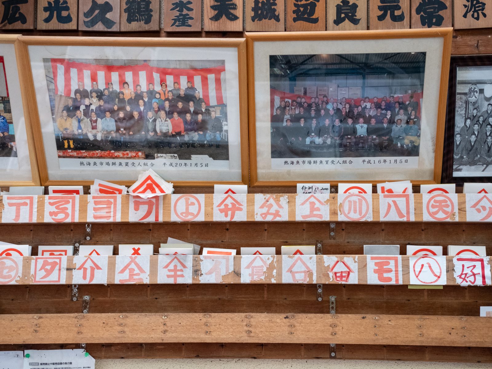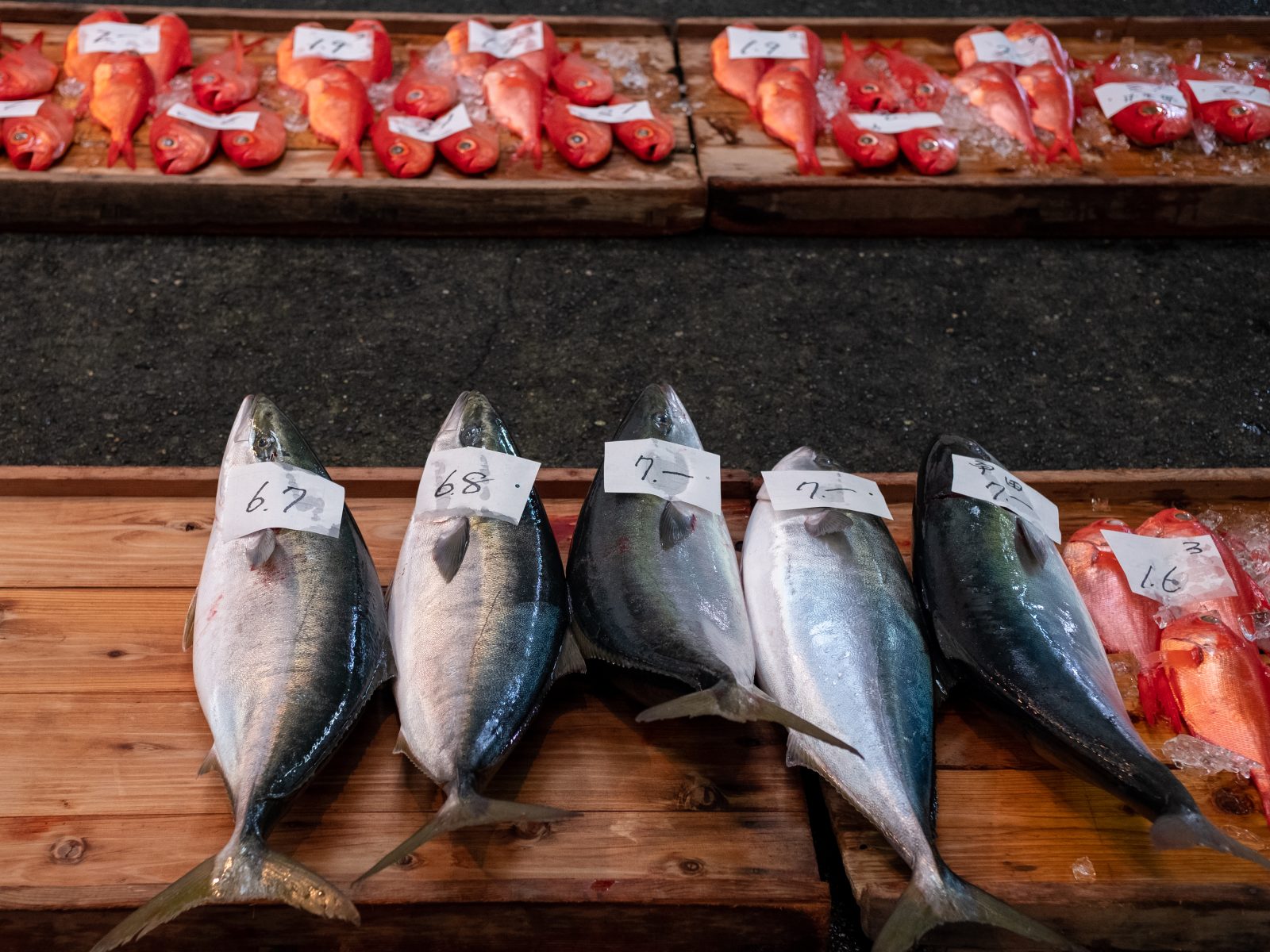 キロ数の書かれた魚の上に、様々な屋号の札が置かれていく。