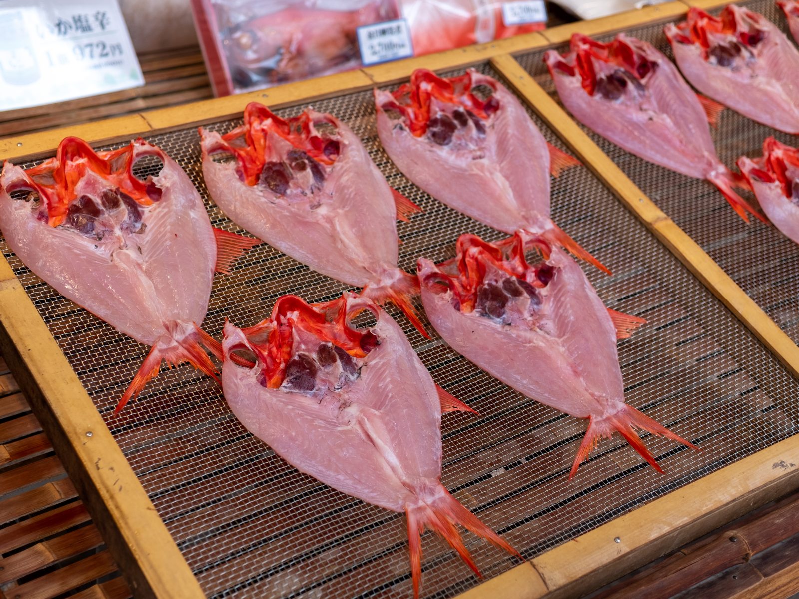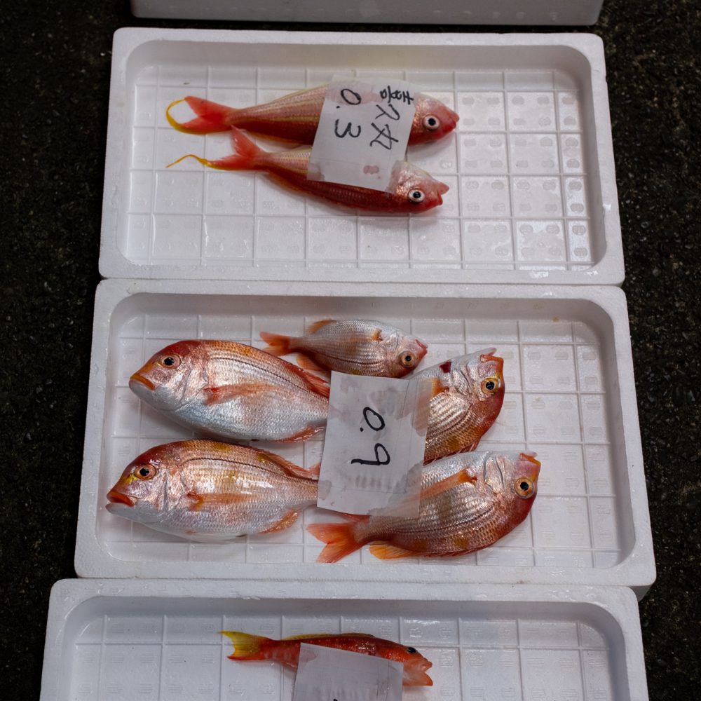 朝ごはんのあとは釜鶴さんでみんな思い思いに干物をおかいもの。ちょうど金目鯛の干物が店頭に運ばれてきました。わたしはエビとかますと豆鯵の干物を購入。気づけば子供が好きな種類の魚ばかり買っていました。金目の干物も買えばよかった。