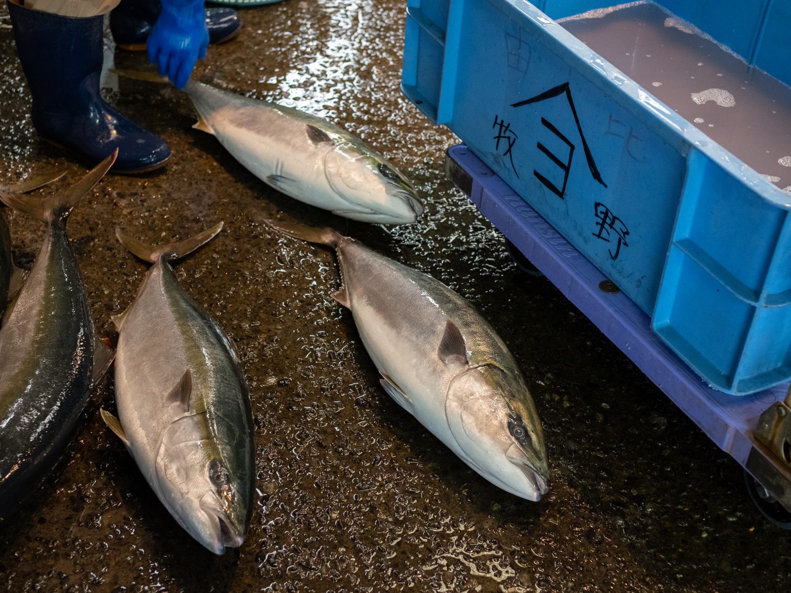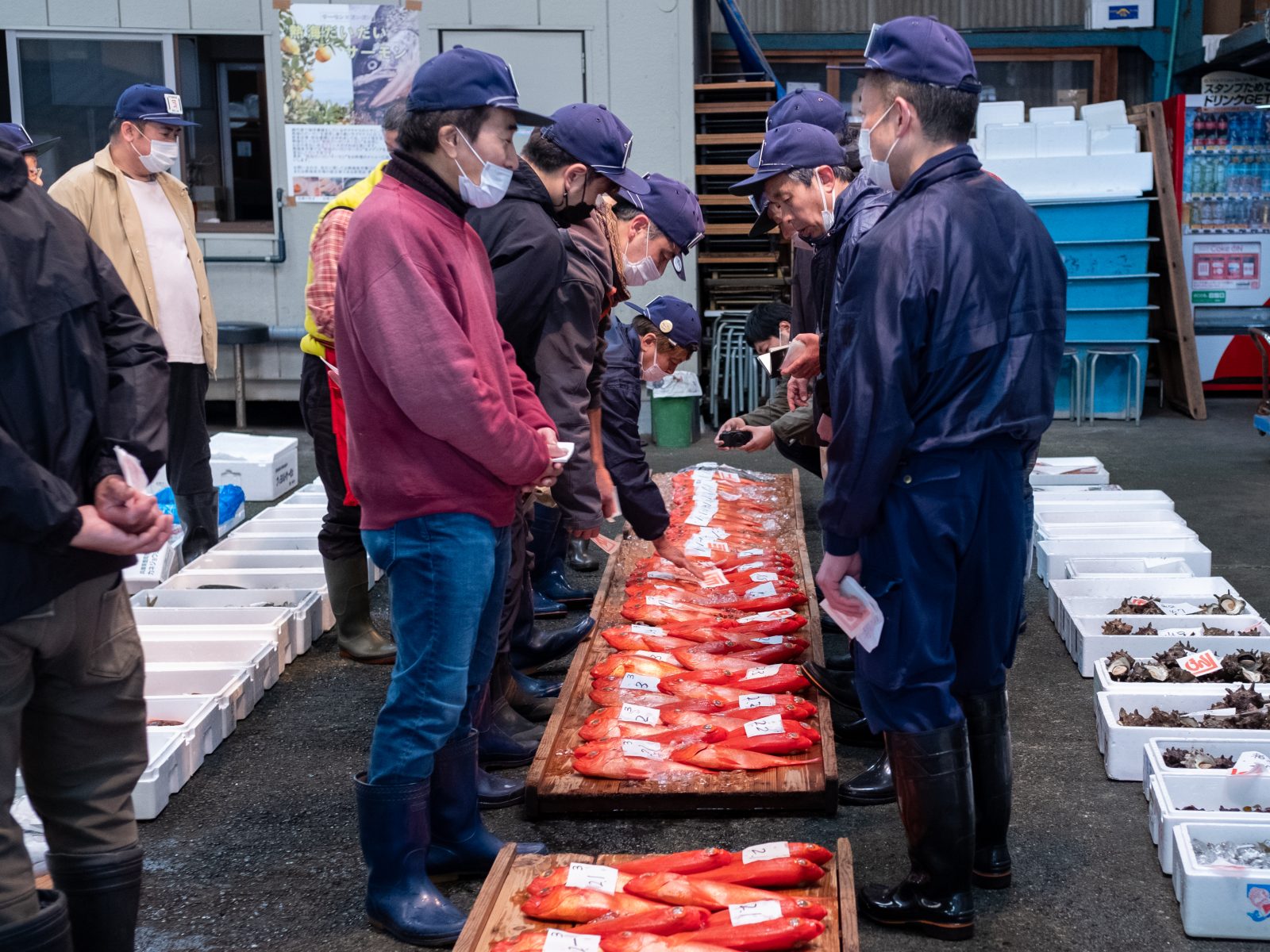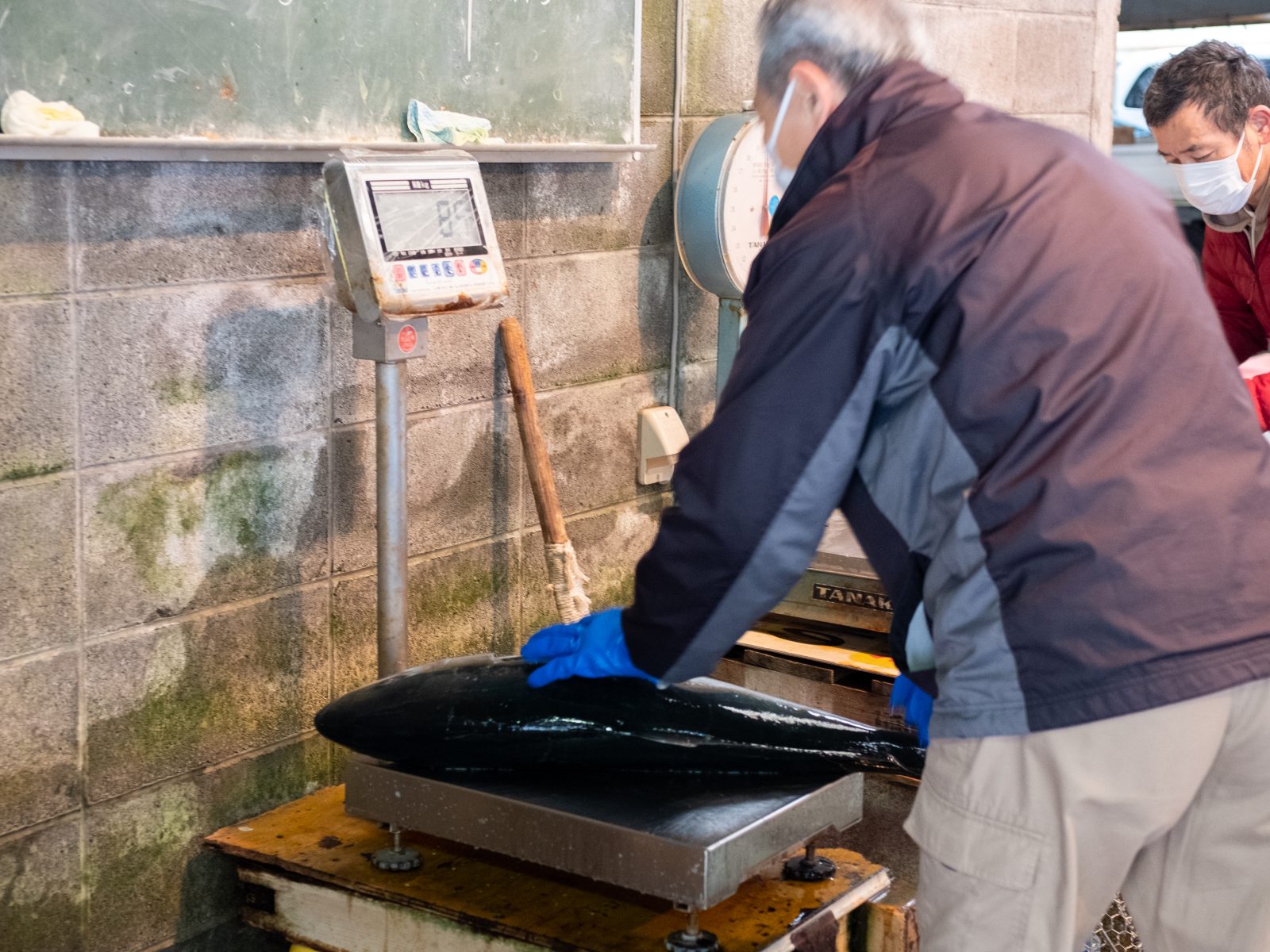 7時半をまわると右手前の魚から順番にせりが始まりました。昨日おせわになった村越魚店さんもせりに参加しています。村越さんの屋号は「山」に「は」。店名と屋号が全然違うのはなぜなんですか?「昔はせりで魚をおとす時に手で紙に屋号を書かないといけなかったから、さっと書ける屋号ってことでこれになったんですよ。」