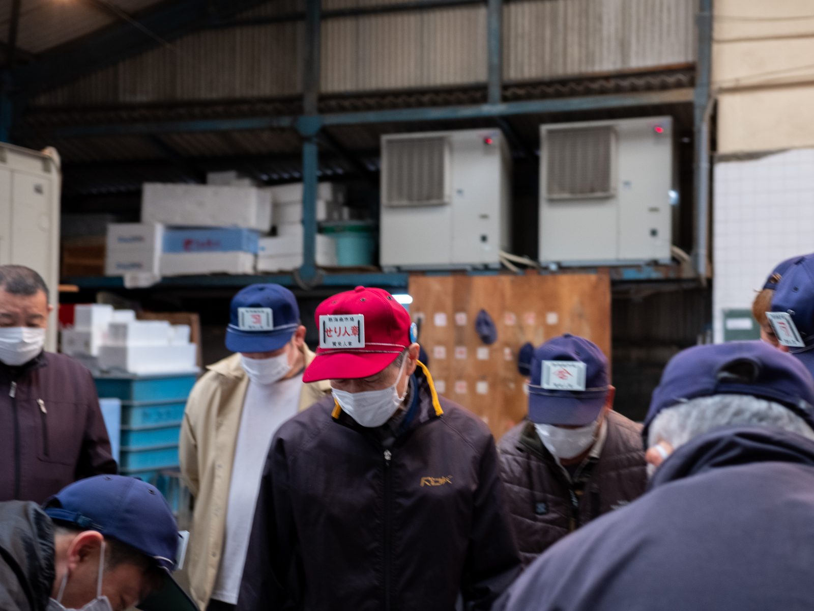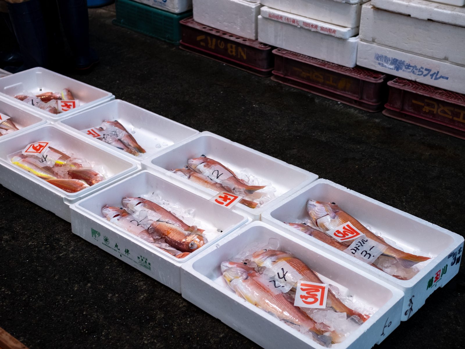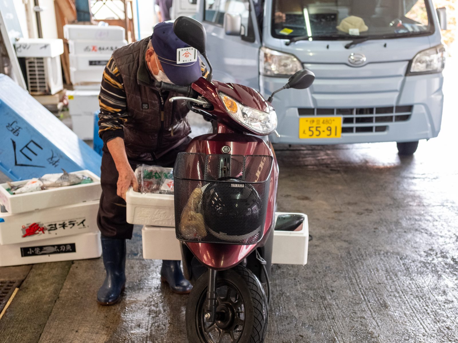 7時半をまわると右手前の魚から順番にせりが始まりました。昨日おせわになった村越魚店さんもせりに参加しています。村越さんの屋号は「山」に「は」。店名と屋号が全然違うのはなぜなんですか?「昔はせりで魚をおとす時に手で紙に屋号を書かないといけなかったから、さっと書ける屋号ってことでこれになったんですよ。」