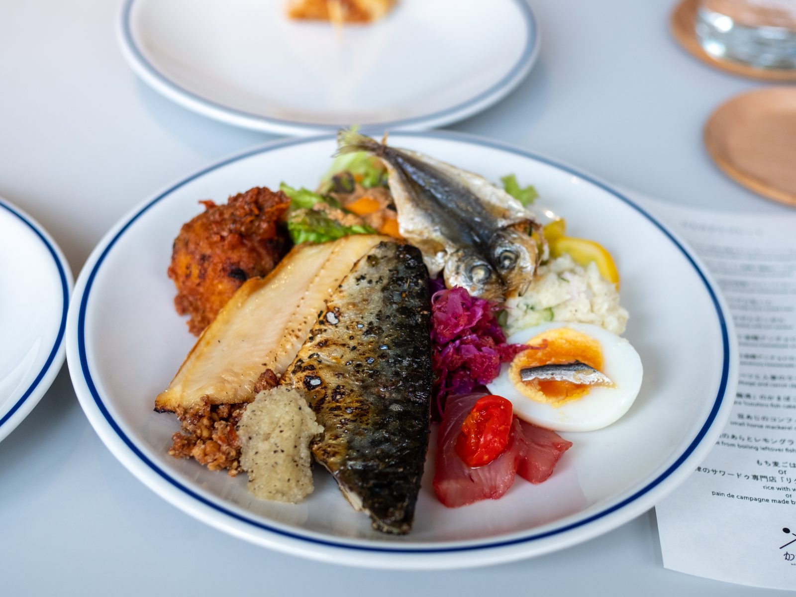 カリカリ、ちょうどいい焼き加減の豆鯵は頭から尻尾まできれいに食べられるんです。左に見えるのはひものコロッケ、釜鶴さんのアンチョビが入ったサラダのドレッシングも絶妙な塩味でおいしいんです。