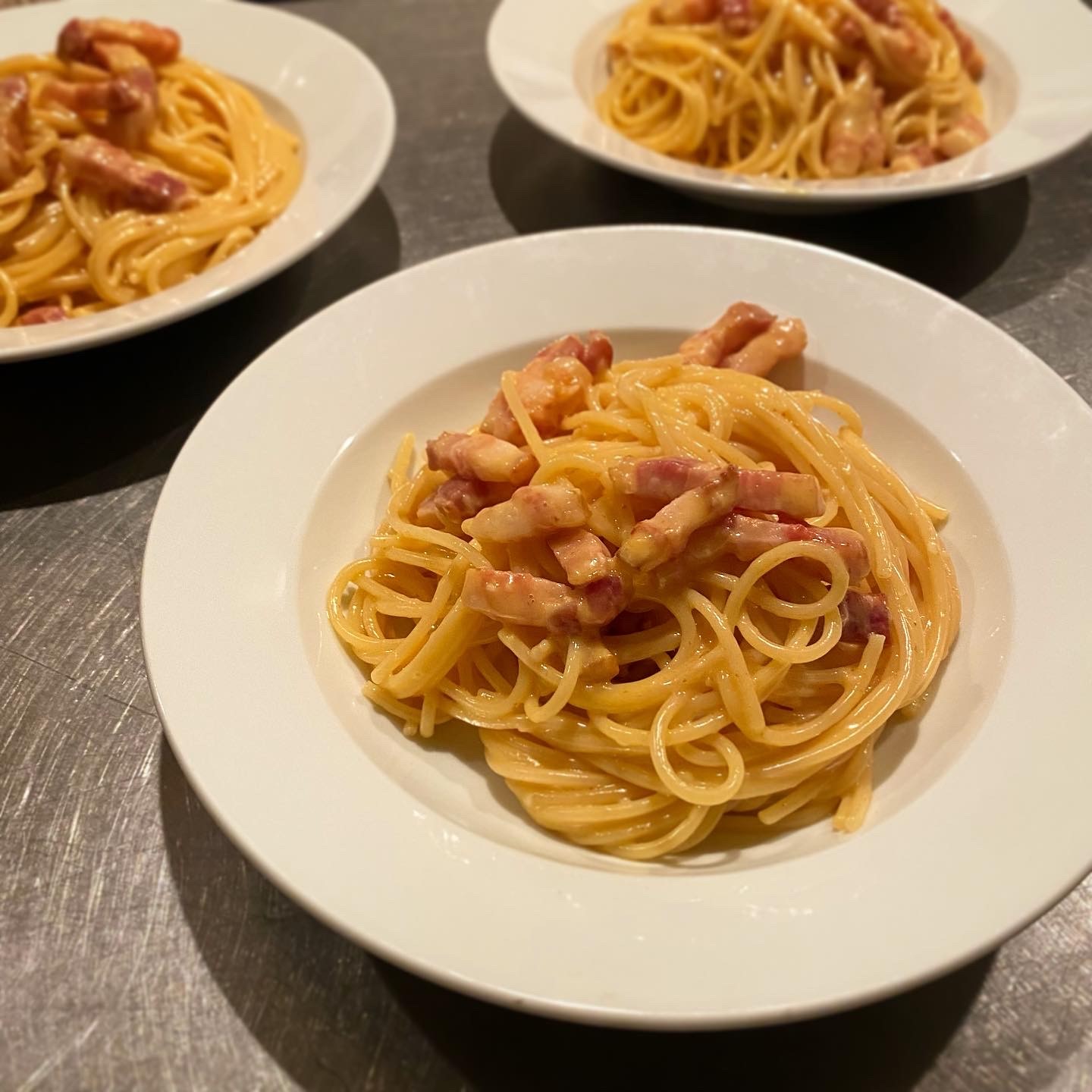 今晩は仕事が早く終わった夫にお任せカルボナーラ。
