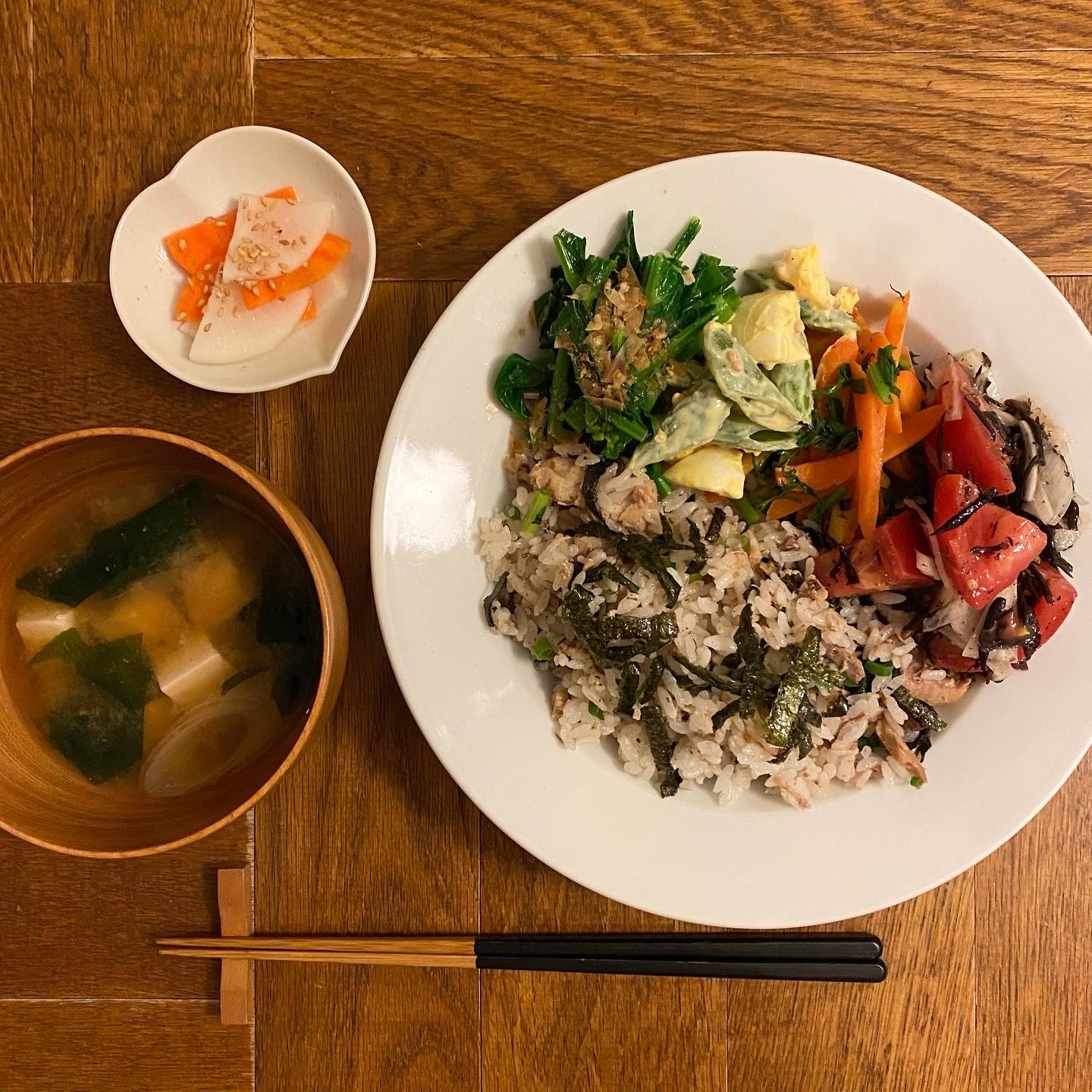 鯖缶混ぜごはん(もみのり、いりごま、小葱)、のらぼう菜の辛子和え、葉つき人参のオリーブオイル炒め、トマトとひじきと新玉葱のサラダ、水キムチ(大根、人参)、味噌汁(昨日の)、白ごはん