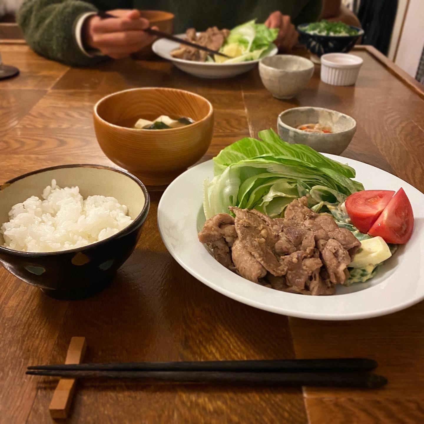 生姜焼き(レタス、トマト)、スナップエンドウとゆで卵の粒マスタード和え、味噌汁(豆腐、長葱、ワカメ)、切り干し大根煮、白ごはん