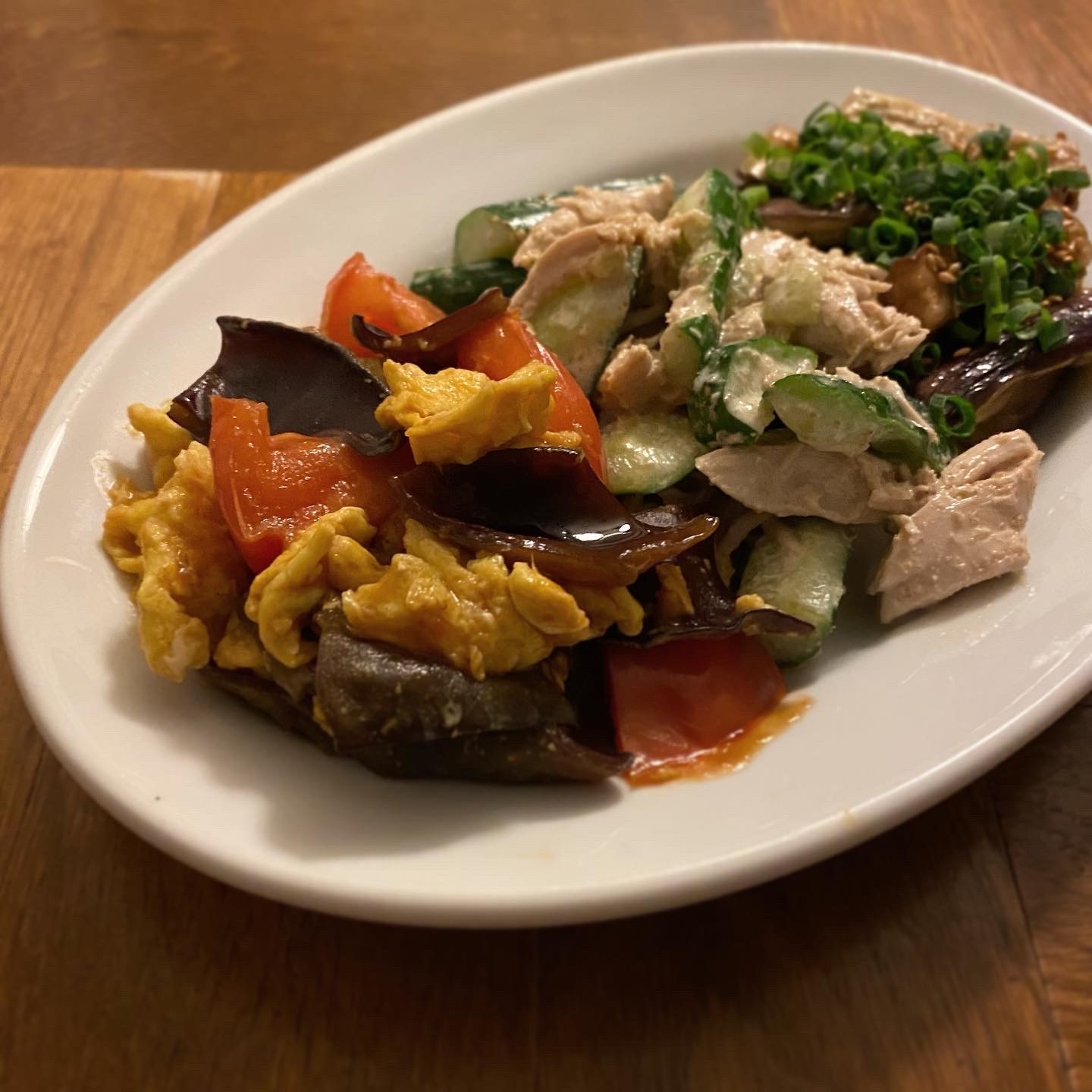 棒棒鶏、トマトと卵とキクラゲの炒め物、蒸し茄子、もずく酢(蛸入り)、ワカメスープ、白ごはん