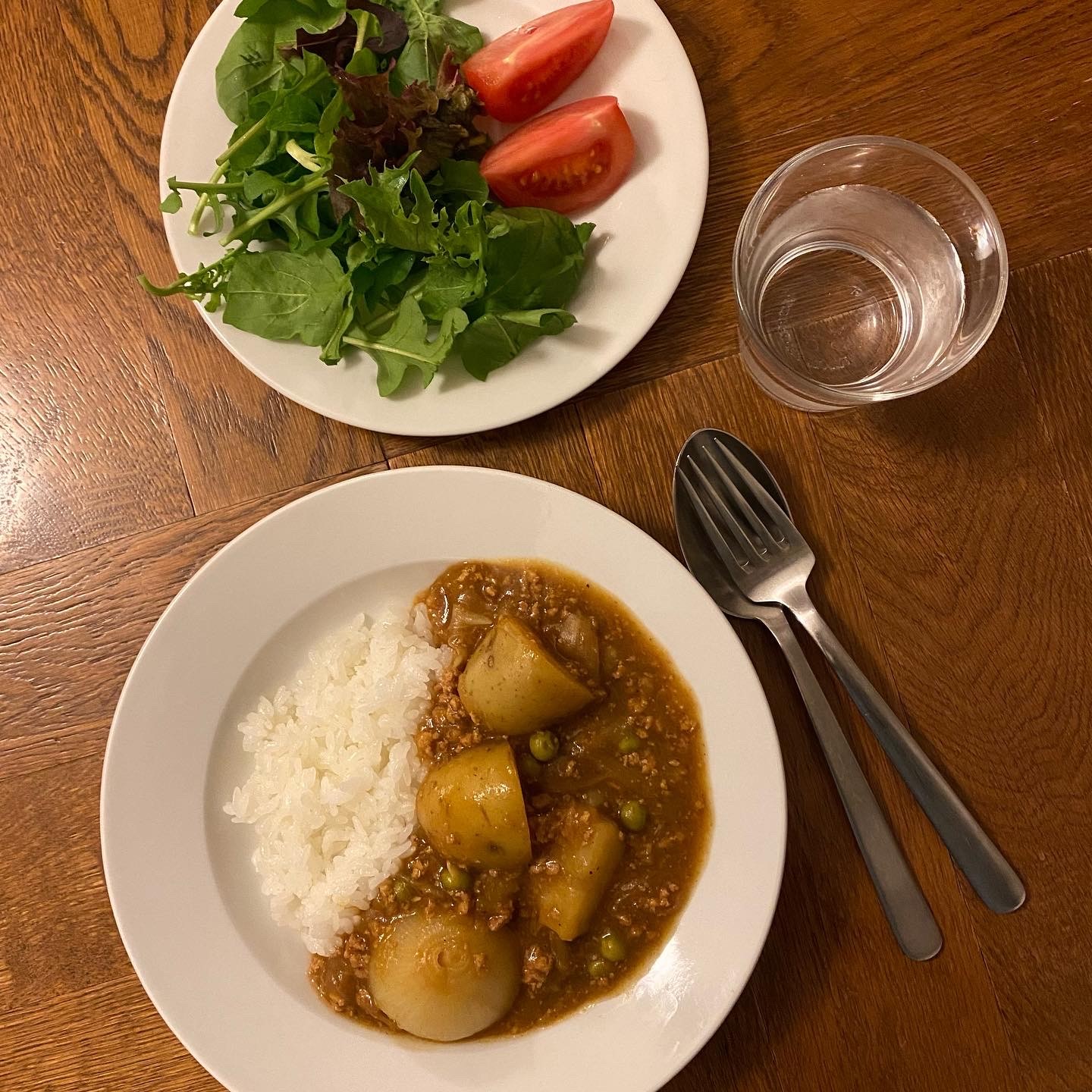 カレーライス(鶏ひき肉、新玉ねぎ、新じゃが、えんどう豆)、葉っぱとトマトのサラダ