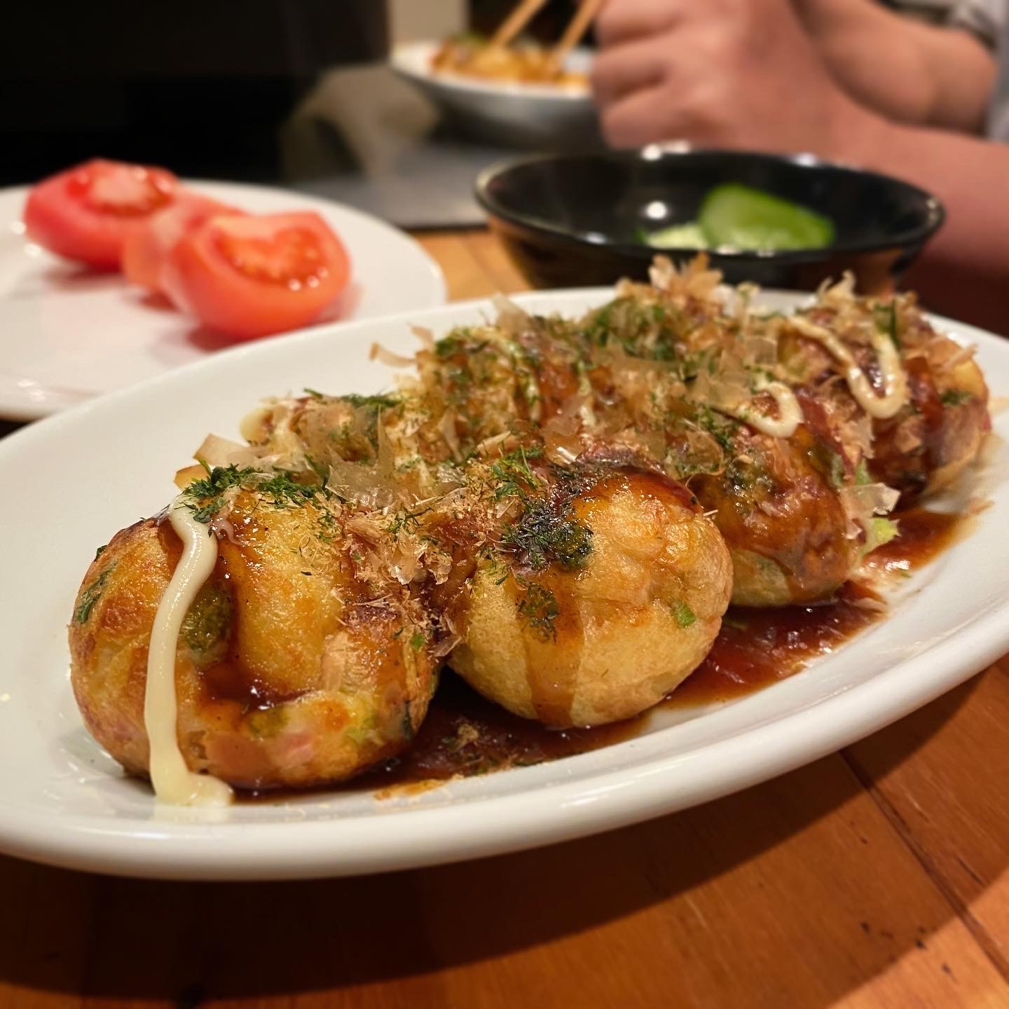 たこ焼き、細巻き(買ってきた)、チャンジャ(買ってきた)、水キムチ(昨日の)、トマト