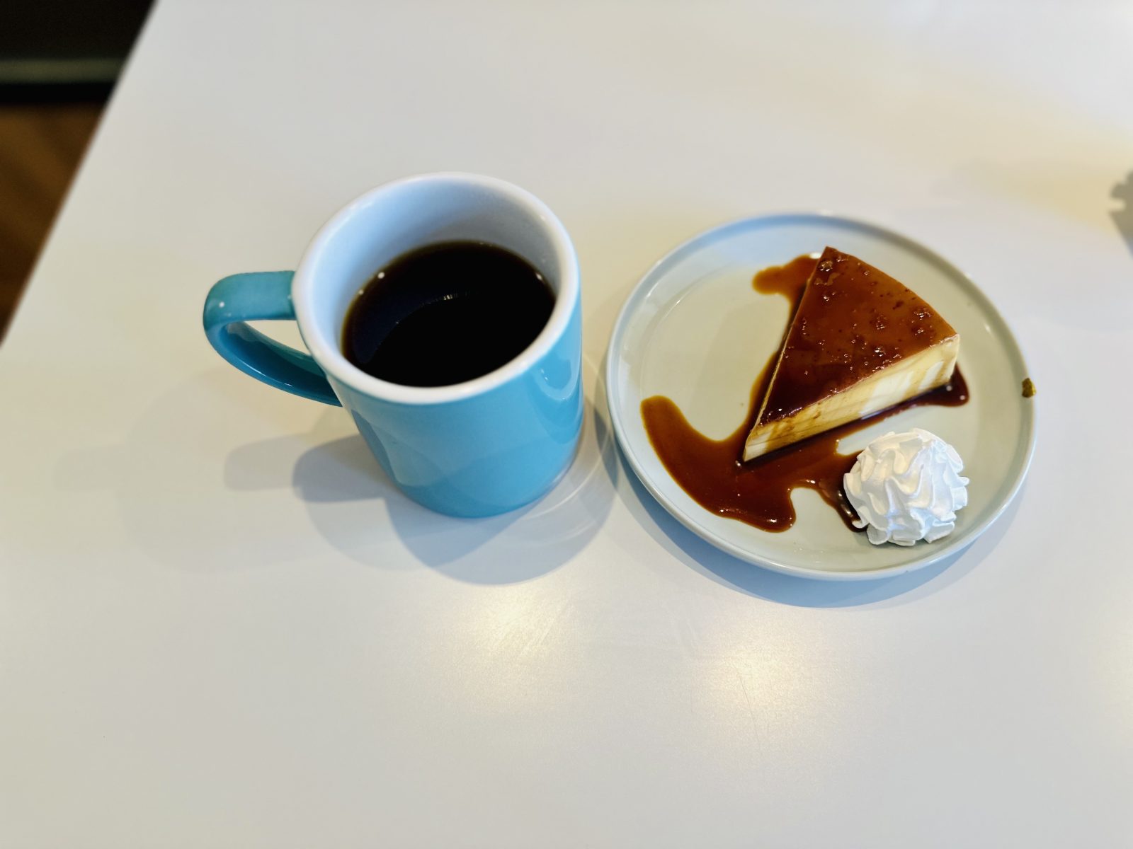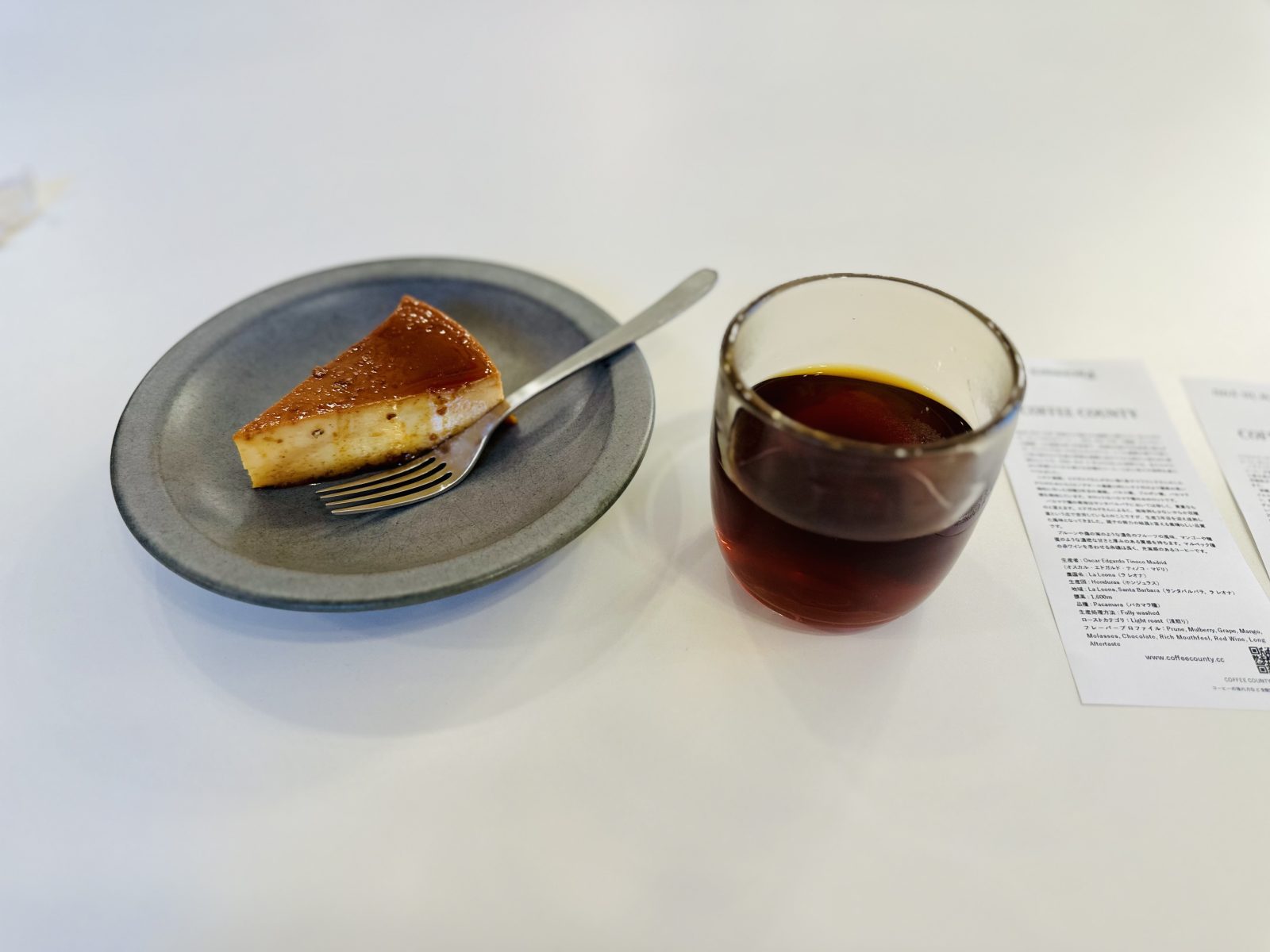 コーヒーを2杯(2種類)とプリンを注文。最近、固そうなプリンを見かけると頼んでしまう。