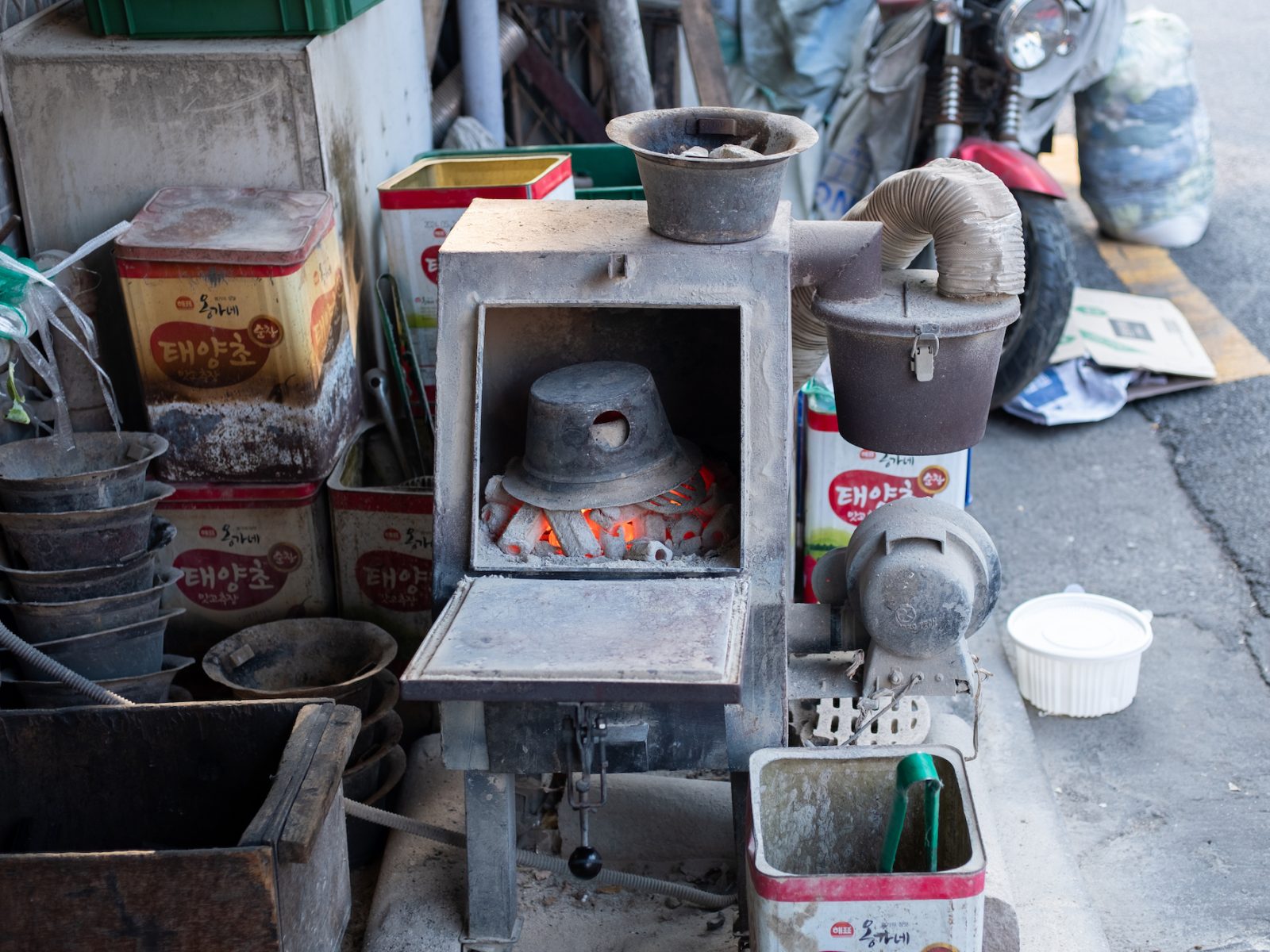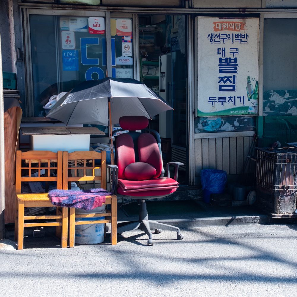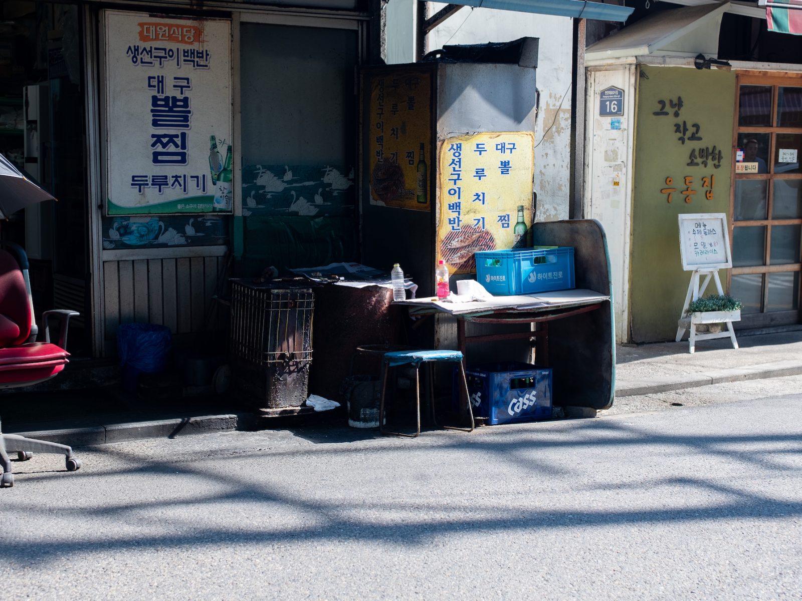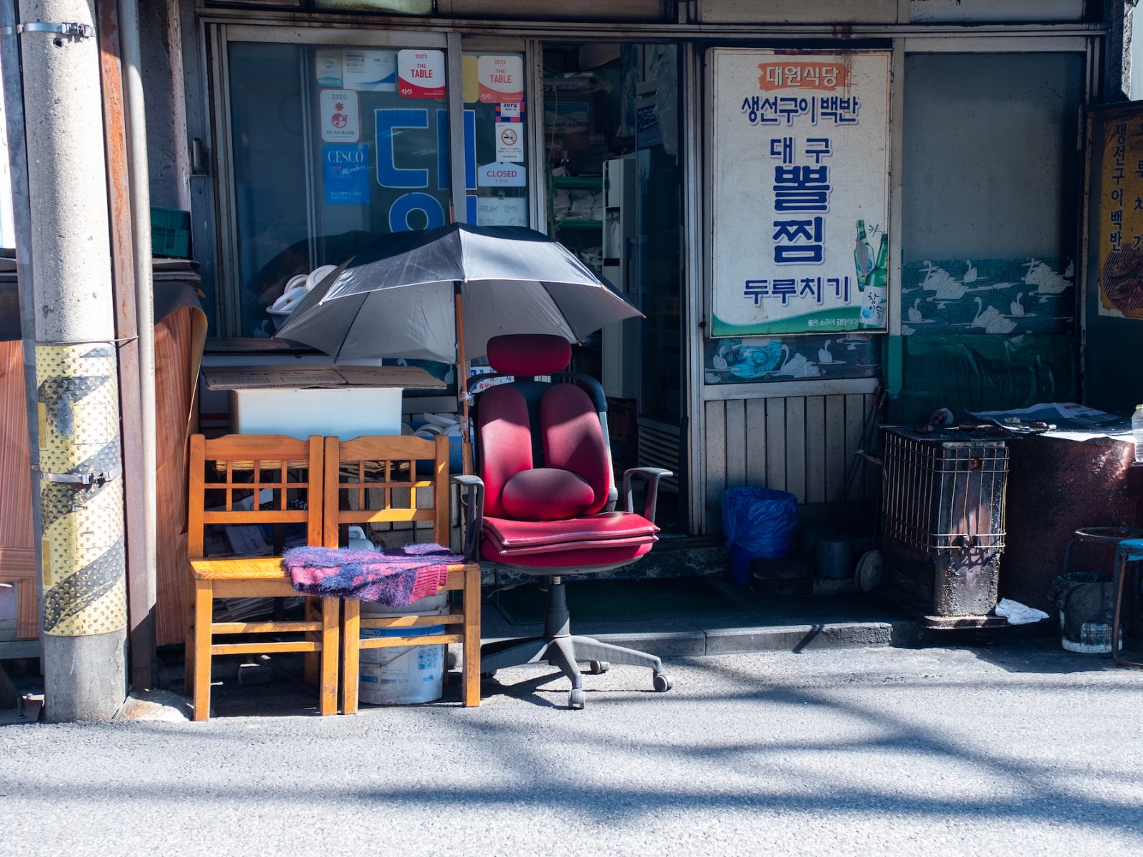 龍山駅に向かう途中、行きたかった焼き魚の定食のお店テウォン食堂がありました。店の前にはお母さんが魚を焼く定位置に置かれたワインレッドのオフィスチェア。夏の強い日差しからリクライニングの椅子を守るように、傘が影を作っていました。