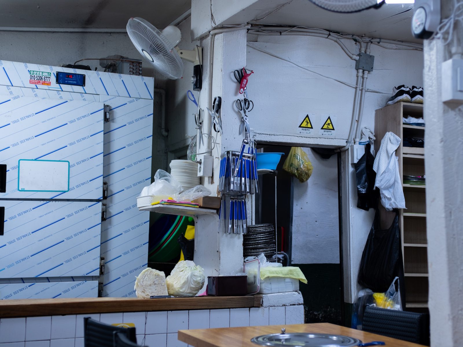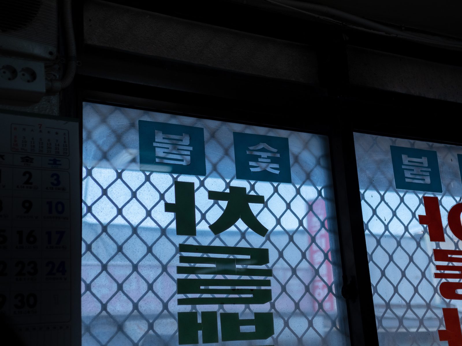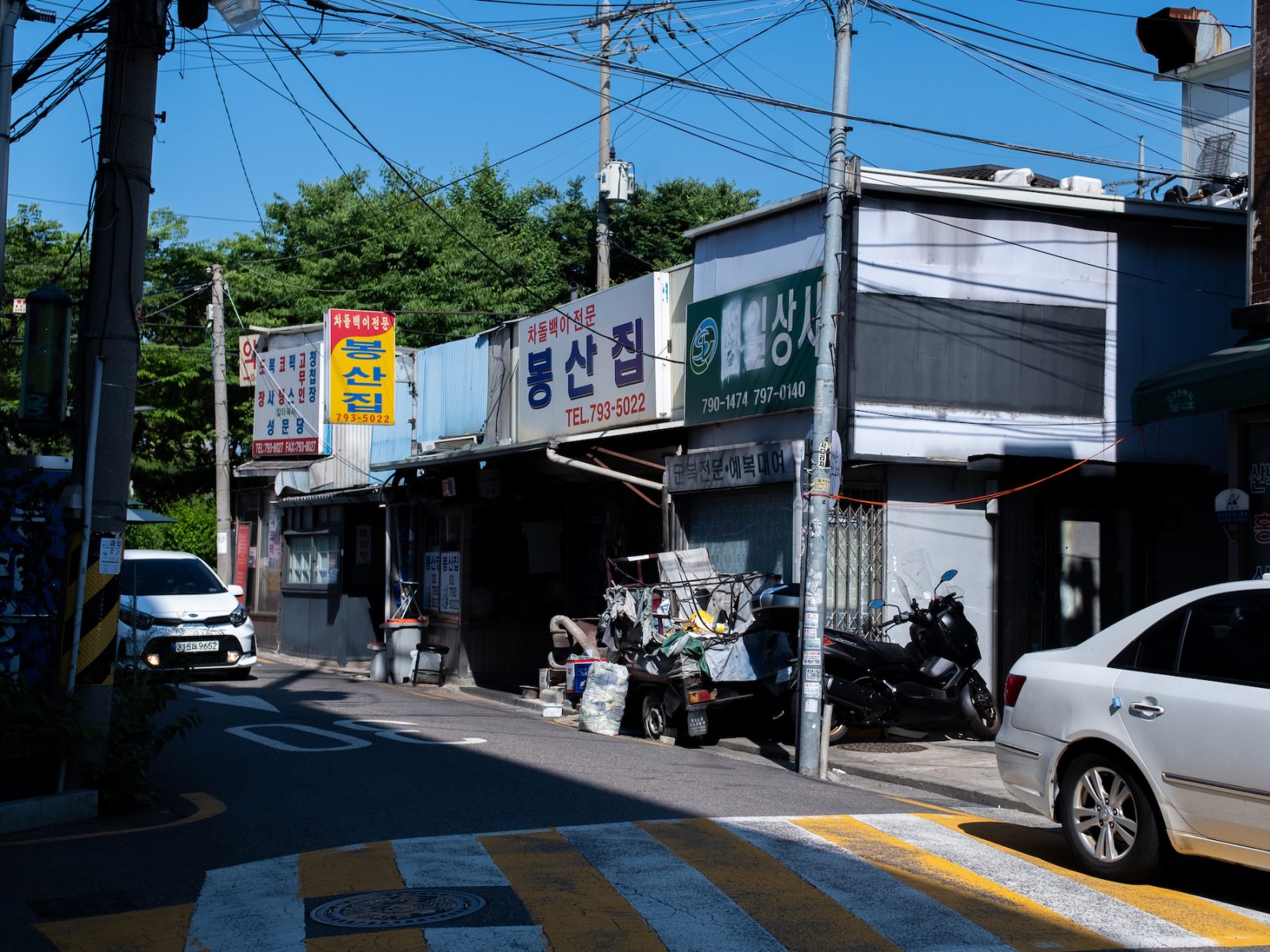 龍山駅に向かう途中、行きたかった焼き魚の定食のお店テウォン食堂がありました。店の前にはお母さんが魚を焼く定位置に置かれたワインレッドのオフィスチェア。夏の強い日差しからリクライニングの椅子を守るように、傘が影を作っていました。