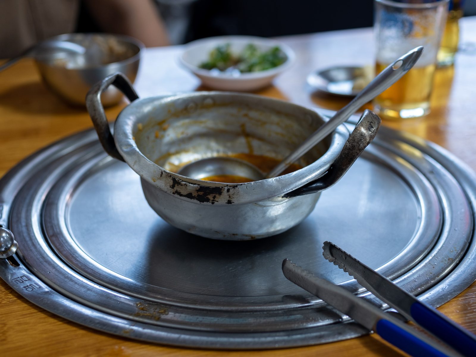 テーブルの真ん中に入った炭火の上で、凍った状態の薄いお肉を焼いていく。脂身に先に火が通るから、肉の花がフリルのように咲いていく。薄いお肉で山盛りのネギと青唐辛子を包んでそのまま口に運ぶ。甘い。お肉が甘い。青唐辛子は辛すぎず、口の中の甘みをしゅっと引き締めてくれる。あっという間に2人分のお肉がお皿から蒸発しました。