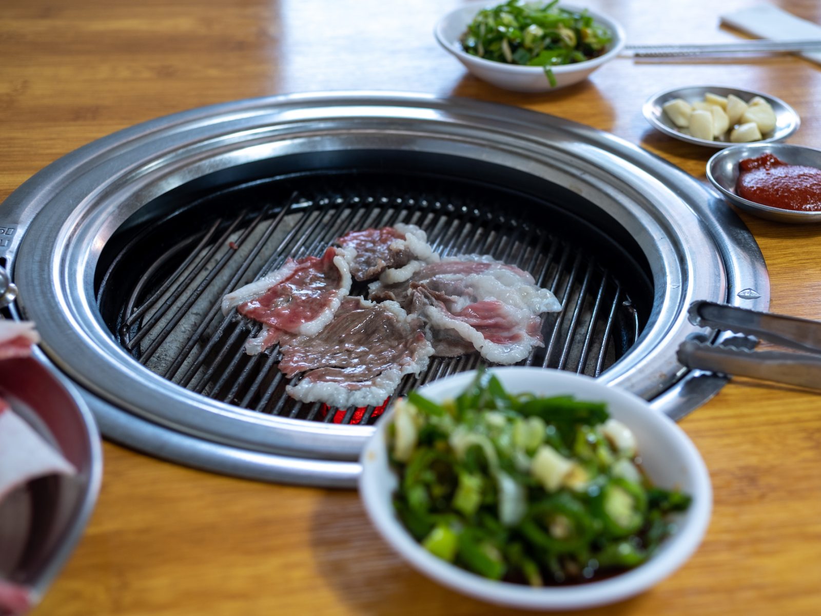 三角地から龍山まではそんなに遠くないし、とりあえず外観だけでも見に行こうかと三角地駅で下車。13番の出口を出ると、夏の日差しが道を白く照らしている。大通りから一本入った場所にあるお店までは3分ほど。注文が入ると店の前の炭火の上で、お店のお母さんが魚を焼いてくれるスタイル。写真だけはなんども見ていたテウォン食堂。角を曲がるとそれらしい炭火焼のお店が並んでいる。ランチ終了ぎりぎりの時間だったこともあって、店の看板をよく見ずにこんな外観だったと一軒の店に飛び込んだ。店内のメニューを見ると생성구이(センソンクイ)=焼き魚の文字が見当たらない。メニューの看板に書かれているのは「차돌박이(チャドルバギ)」。キヨちゃんごめん。これは完全に違うお店に入ってしまった。でもせっかくだから食べて行く?優しいキヨコ。横に座っていたお母さんと高校生くらいの娘さんが頼んでいた차돌박이(チャドルバギ)。冷凍の状態で薄くカットされた牛肉が、ステンレスのお皿にくるくるした状態で山盛り乗っている。