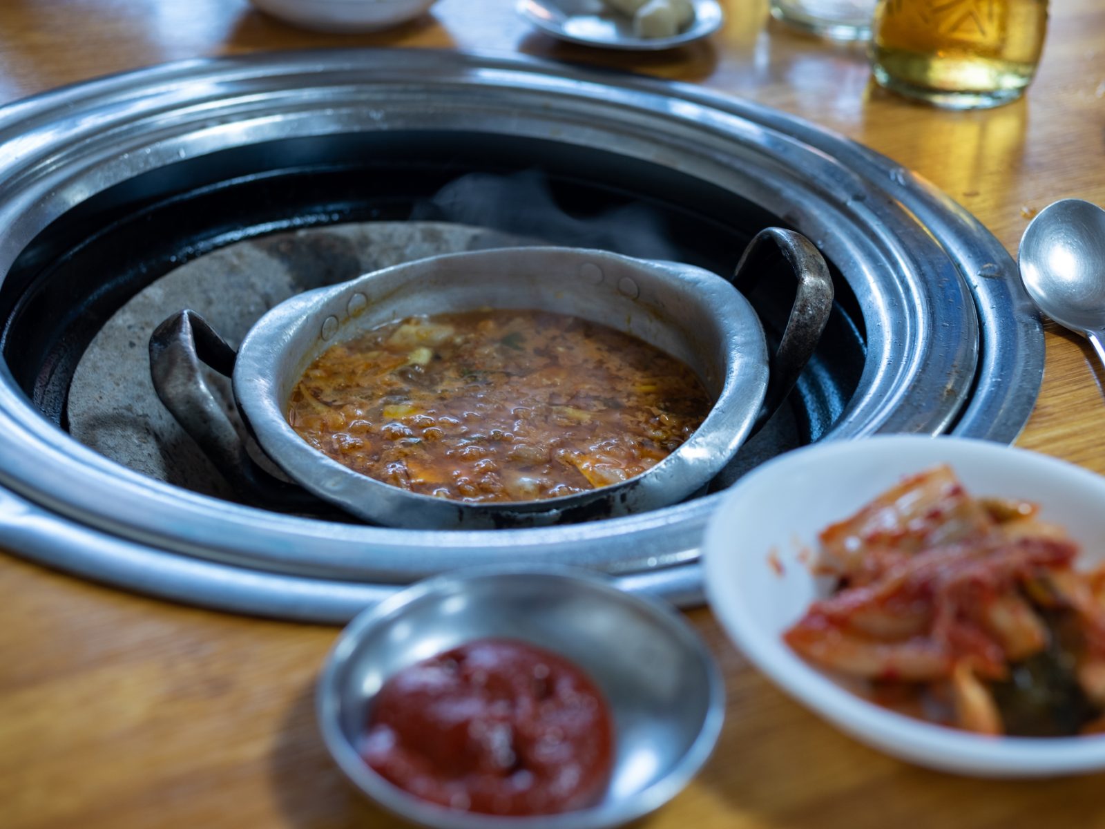 チャドルバギの肉の切れ端がたっぷり入った豆腐のチゲ。日本で味噌汁を飲む時に、香ばしいという表現を使うことはなかなかないと思うのですが、韓国のテンジャン(みそ)チゲには香ばしいという言葉がよく似合う。しっかり固めの木綿豆腐もたっぷり、1人前を半分こしたご飯の器に注ぐ。