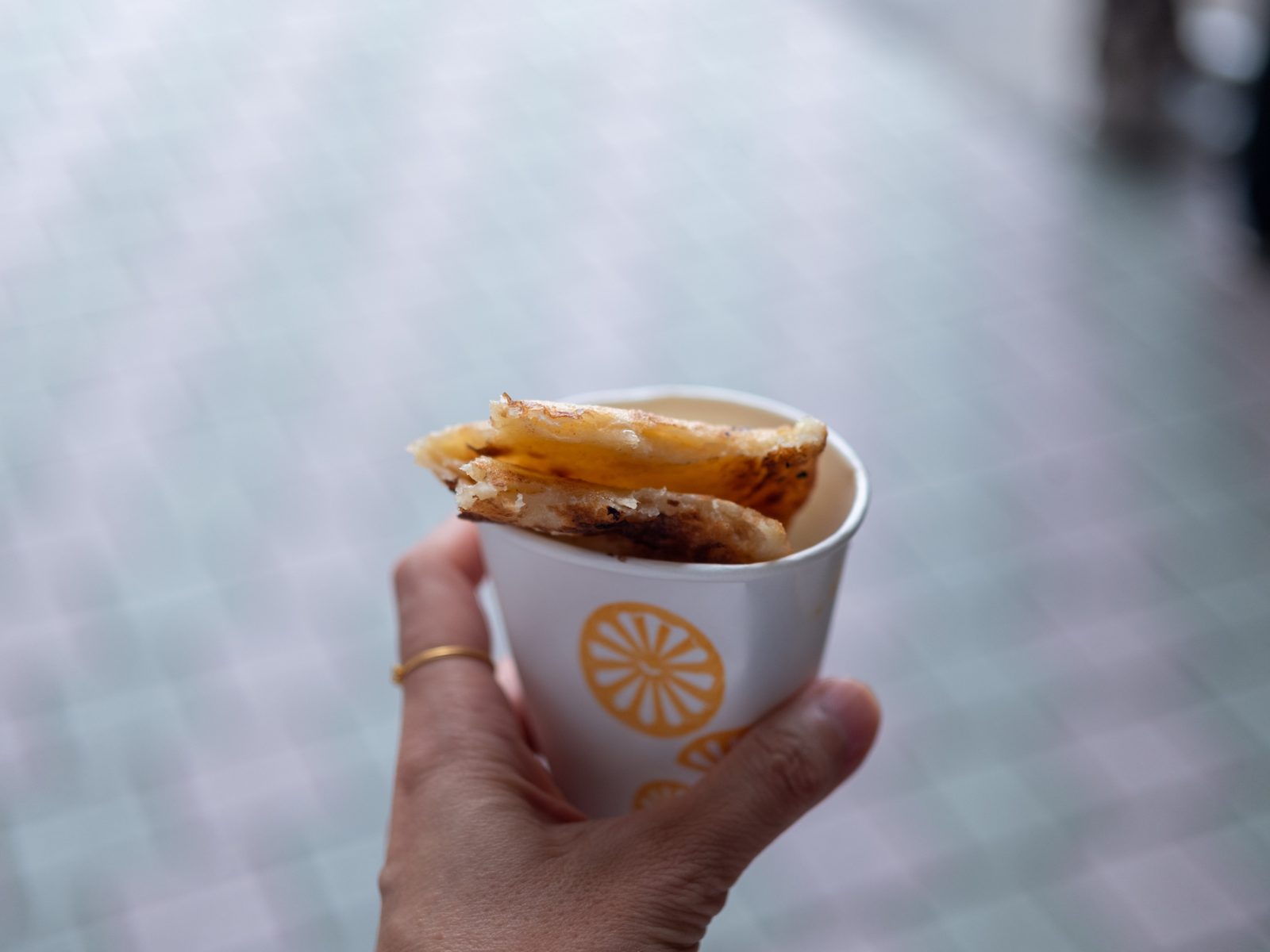 次々に入るホットクの注文。顔はお客さんの方を向きながら、手は休むことなく動き続ける。ホットクを注文して「ここで食べていきます」と伝えると焼き立てのホットクを二つ折りにして紙コップにぽんとさしてくれました。熱々のホットク。おかあさんの手は、わたしの手とは段違いに熱の伝わる速度が違うんだろうな。香りすぎない程度のシナモンの量が嬉しい。さらさらの状態だった砂糖は、生地の真ん中で蜂蜜のようにとろりと溶けていく。外側はさっくり、中はもちっとしていて、思わず「もう一枚!」と注文したくなる味。熱い熱いといいながら、ぺろりと平らげました。