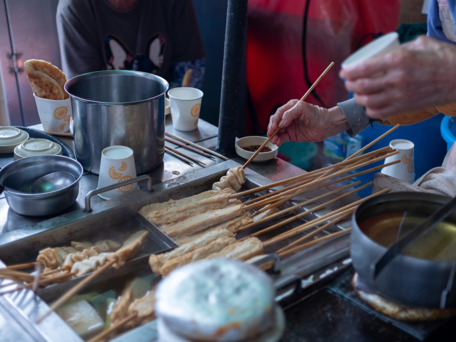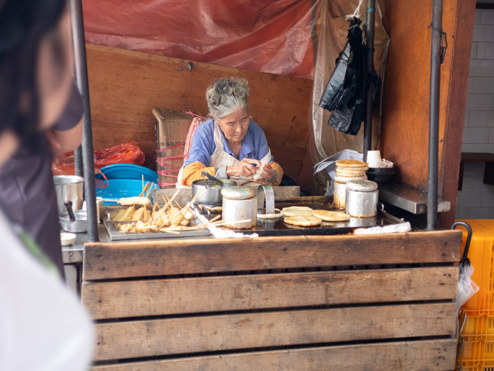 市場を短い時間練り歩いたあと、ゲートの1番にたどり着くと入り口に一番近いお店に人が並んでいました。時刻は14時30分ごろ。昼食の時間をすぎて、食べ物の屋台はどこも静かなのに、そのお店だけはひっきりなしに人が集まる。