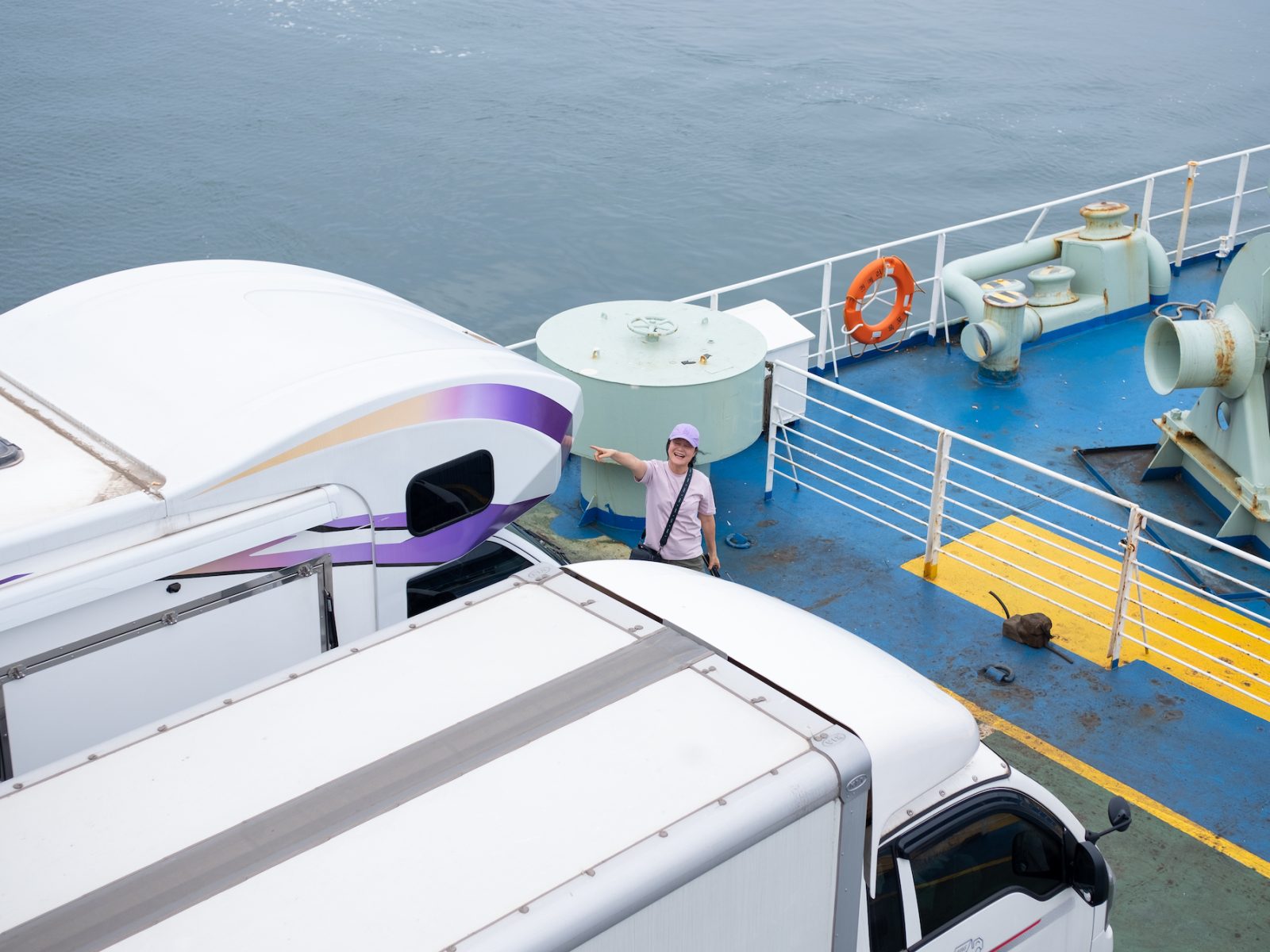 船がチェジュに到着する直前に、車を搭載している階に降りていったキムチをくれたアジュンマが、ひとつ上の階にいた私たちに手を振ってくれました。「これ、わたしのキャンピングカーなの!」旦那さんと友人と。4人でキャンプをするというアジュンマの車。