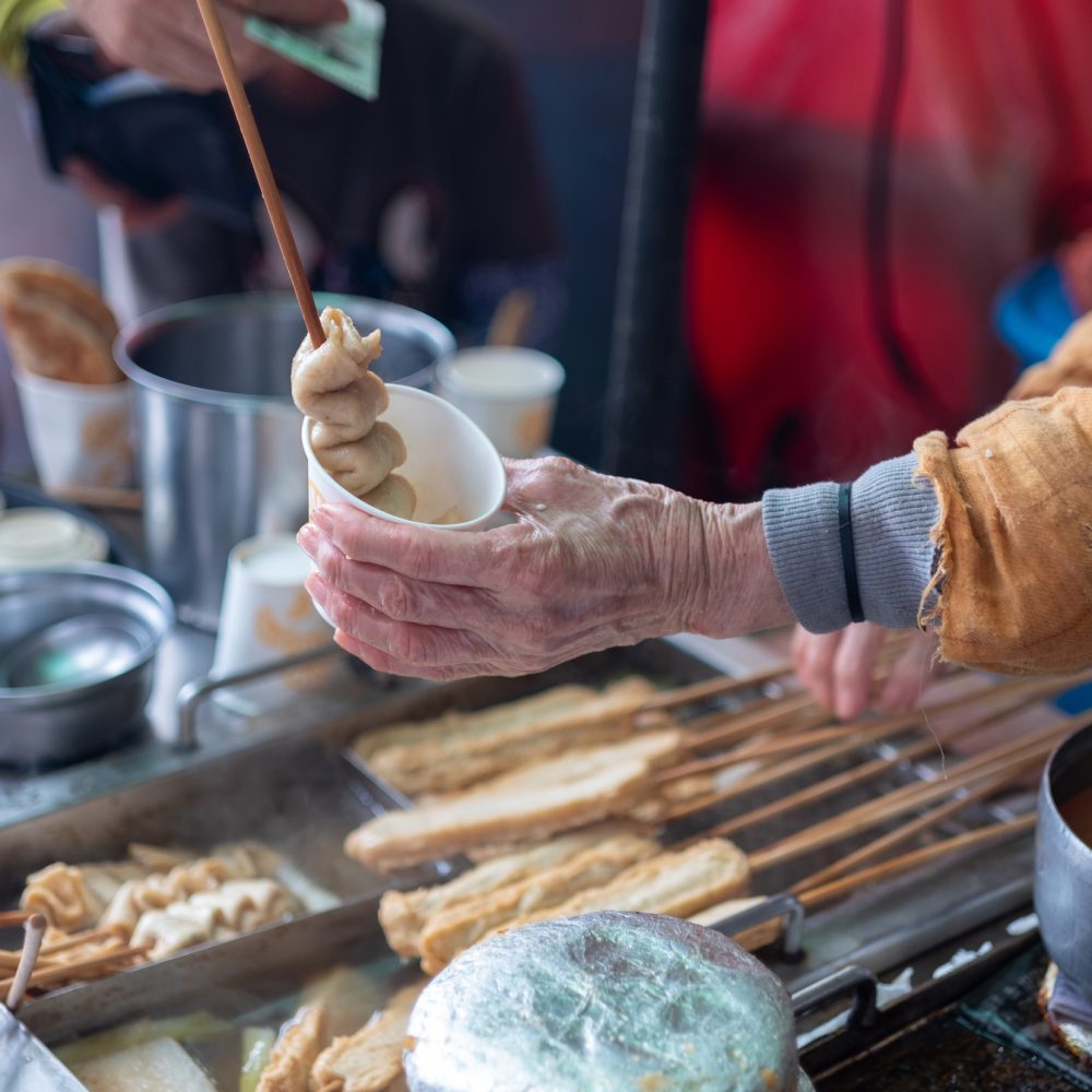 最初に見えたのは、お店のおかあさんのきれいに結った髪の毛。韓国の市場のおかあさんたちの定番アジュンマパーマではなく。銀色の髪をくるっと夜会巻きにして、まとめている。どうやらここはおでんとホットクの店のようで、その場でおでんを食べていく人や、ホットクをかじる人。土産に大量にホットクを買って帰る人など様々。